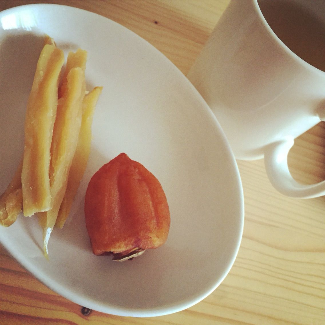 今日のおやつは、干しイモと、干し柿です。うまい。