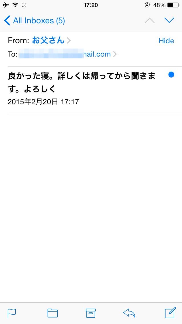 朝手に入れたスマホで、一生懸命頑張ったであろう父からの返信で心がなごみました。(笑)