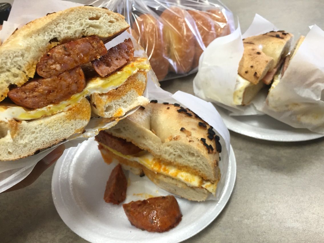 ポルチュギーソーセージとスパムのベーグルサンドイッチ!
