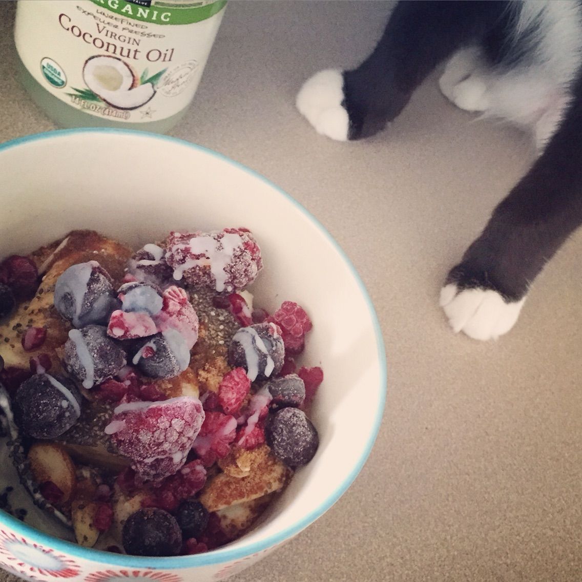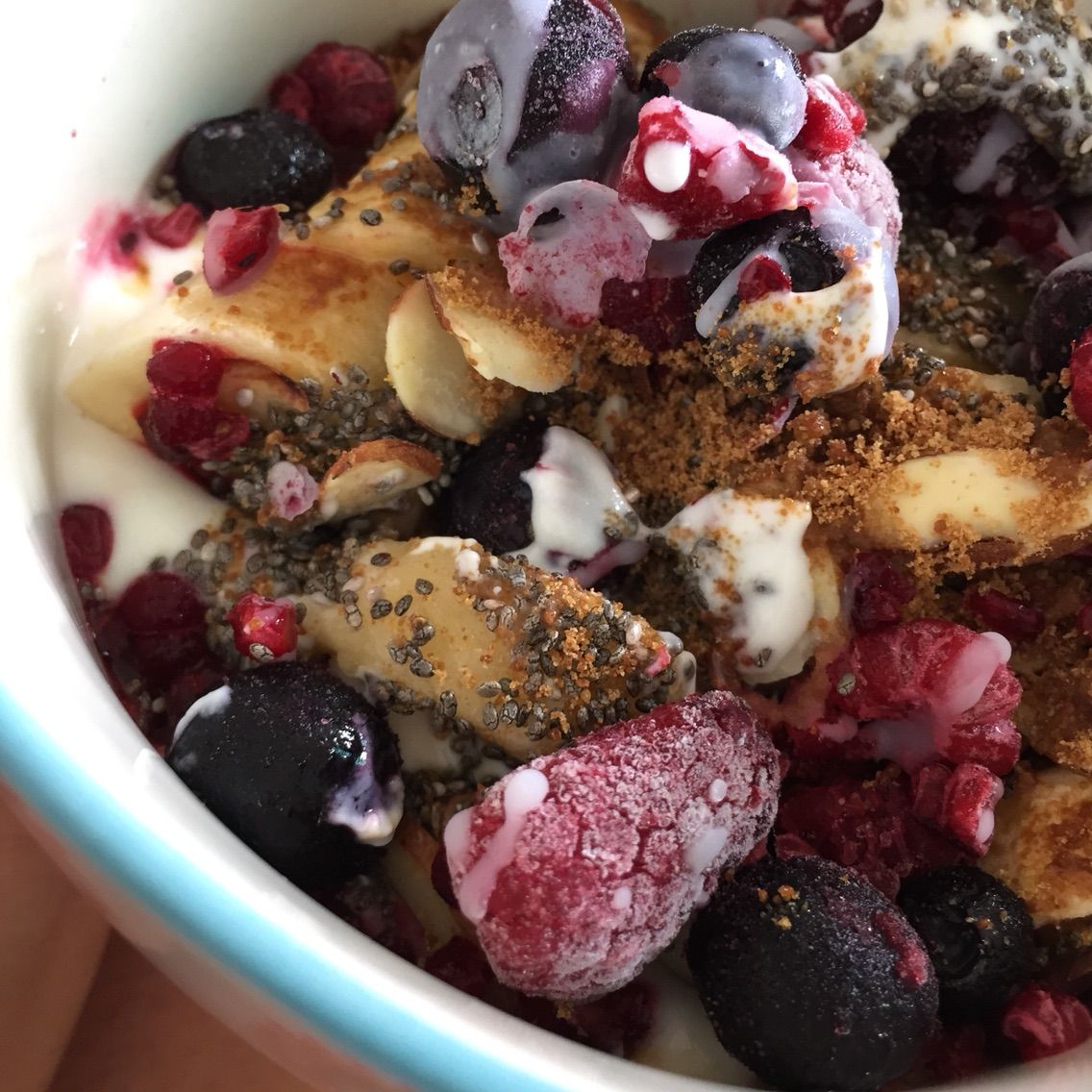 こちらはヨーグルトに冷凍バナナ、チアシード、冷凍ベリー、アーモンド、ココナッツシュガー。最後にココナッツオイルがけ!