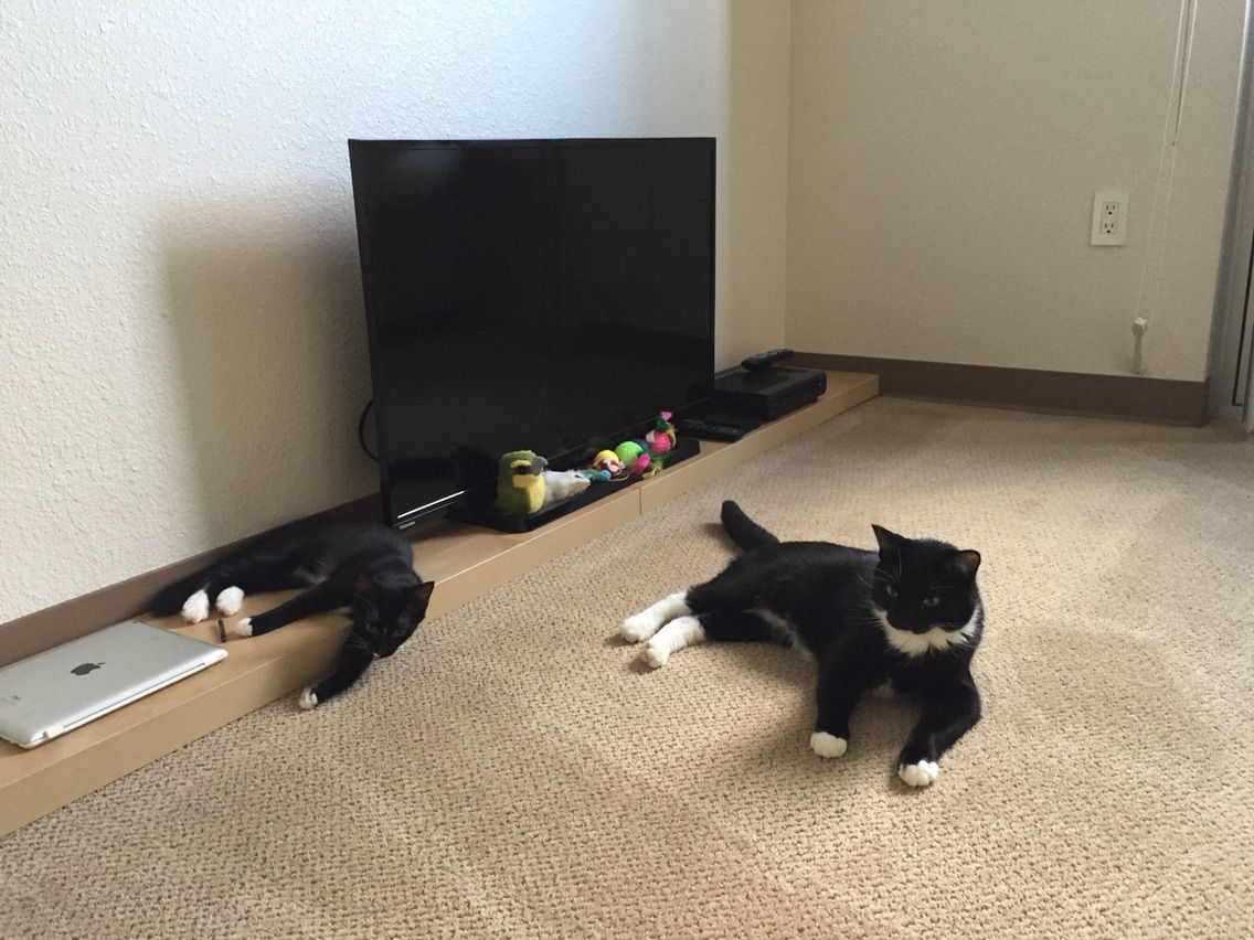 微妙な距離。ぽちが近付くと嫌がる、たま。