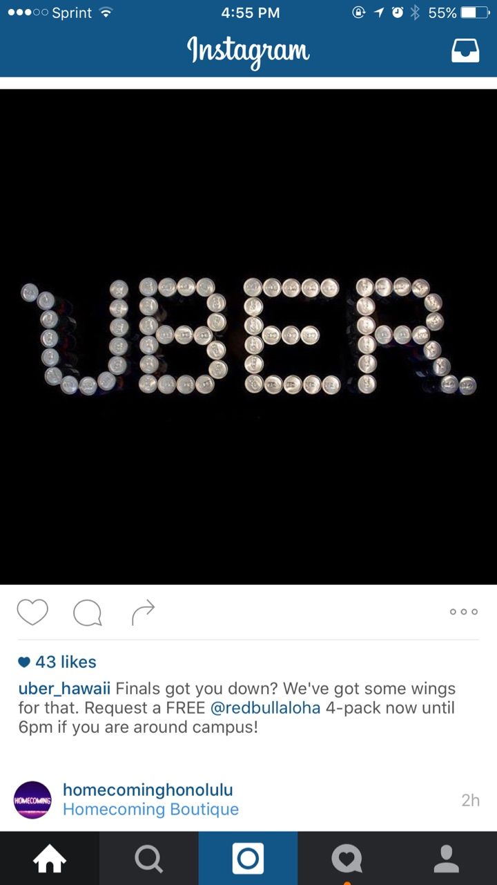 期末テスト中のハワイ大学に、レッドブルをUberが無料でお届けしてくれるというもの!