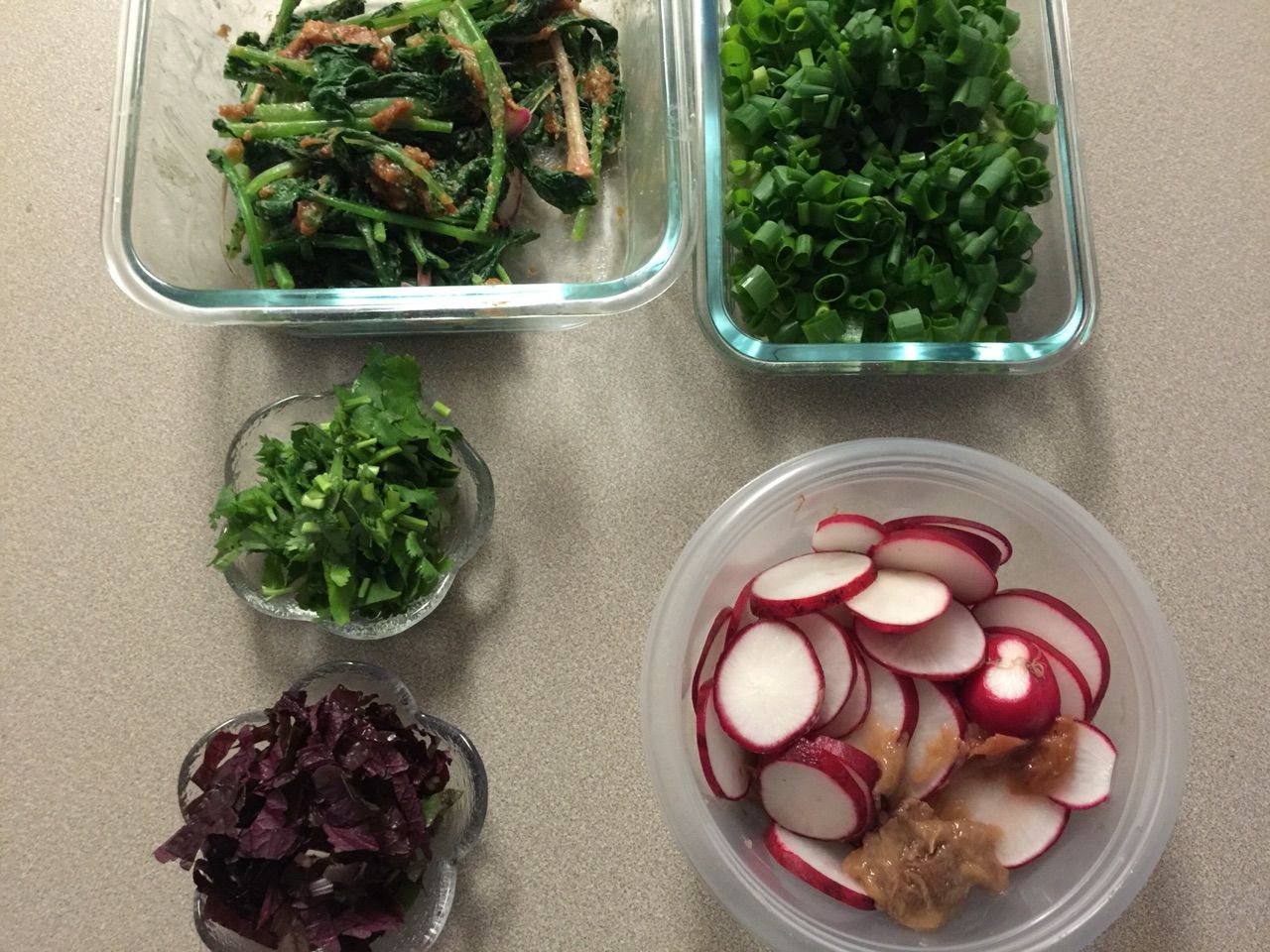 ラディッシュの葉っぱは、ピーナッツバターと味噌で、胡麻和え風。