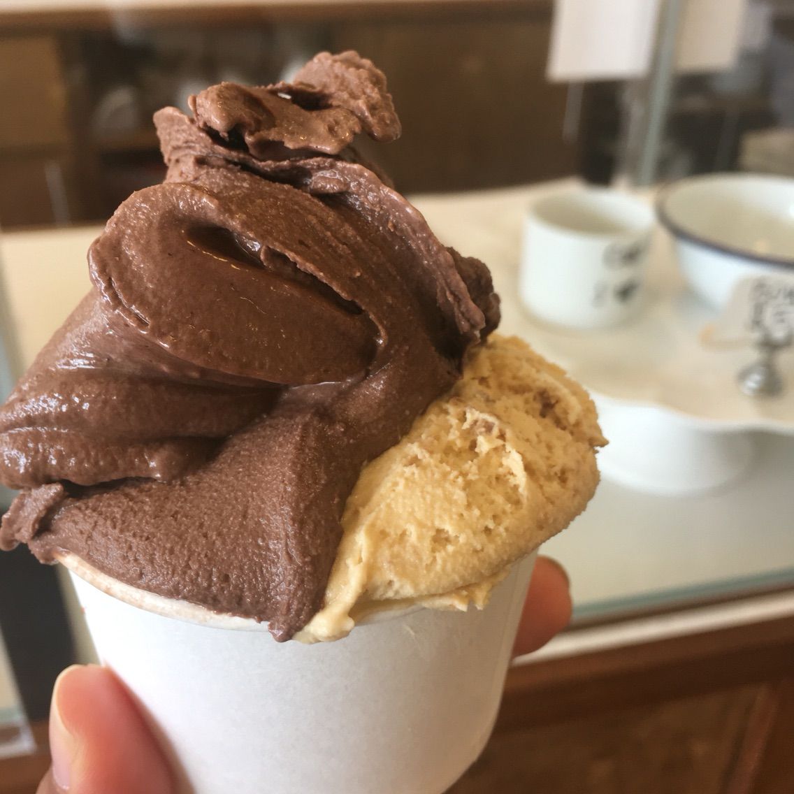 どっしり濃厚、甘いアイスが食べたかったので、スモールサイズをハーフ&ハーフにして、キャラメルとチョコレートに。これで4ドルくらい。