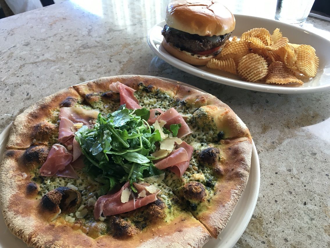 ハンバーガーと、アルグラとプロシュートのピザ♪