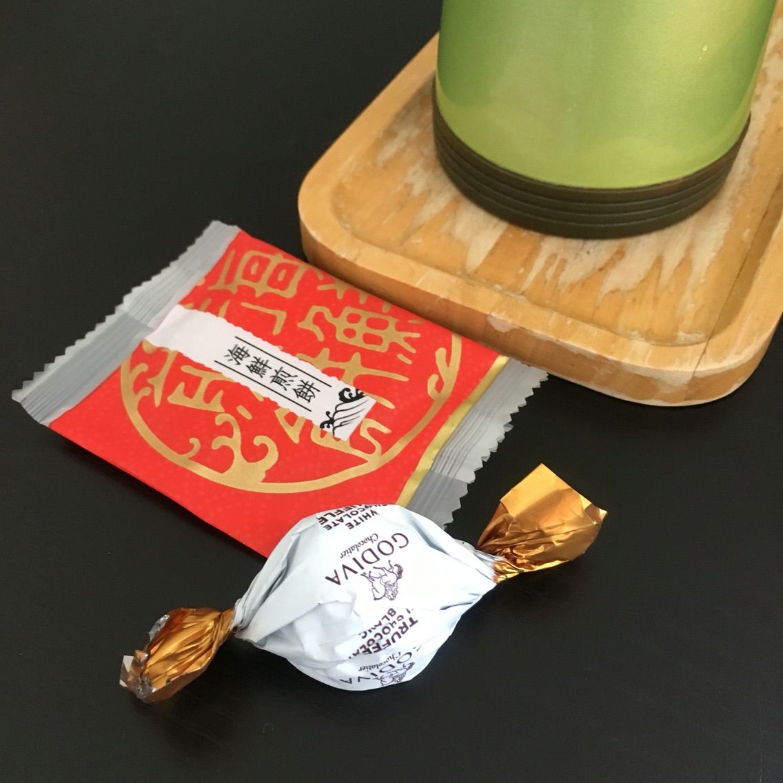 友達にもらった海鮮煎餅(うましっ!)と、ゴディバと、アイスコーヒー。