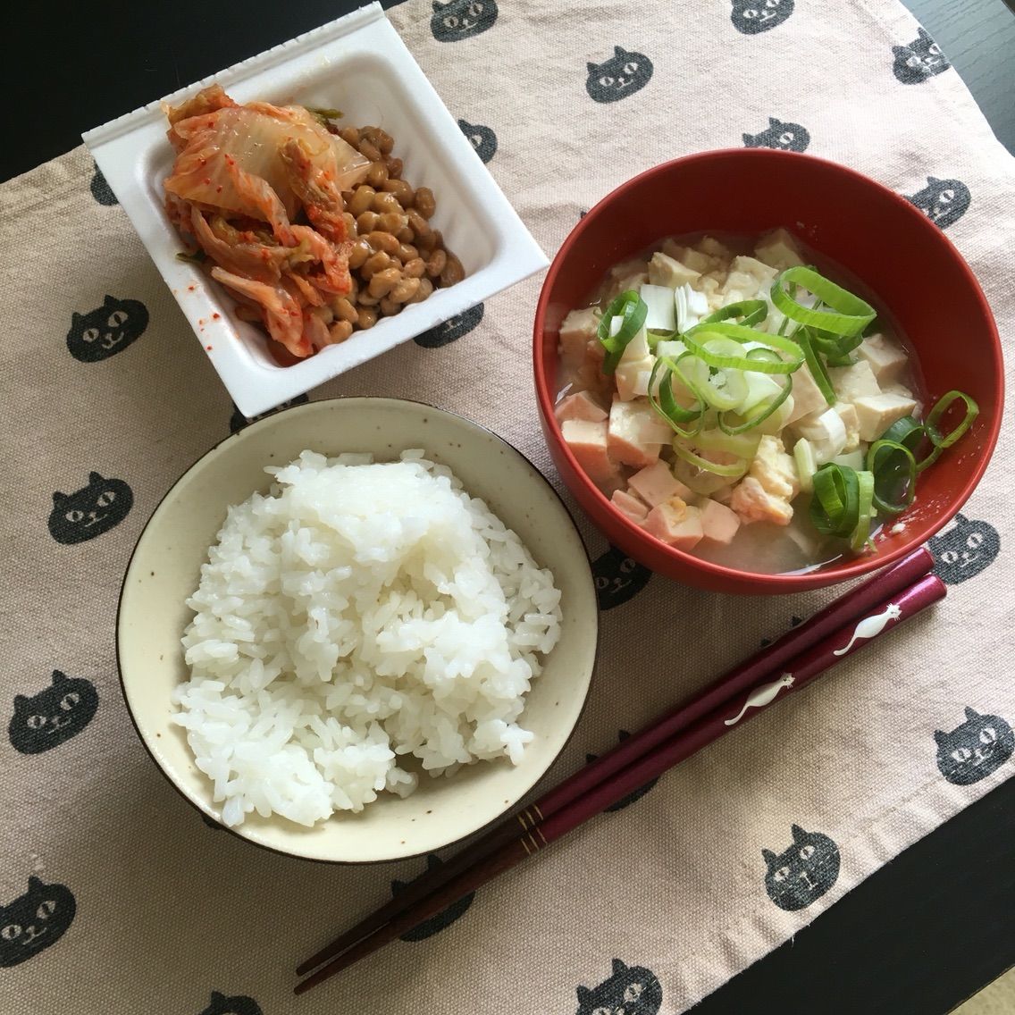 朝ごはんは炊きたてごはんに、豆腐とたまごの味噌汁、納豆とキムチ!