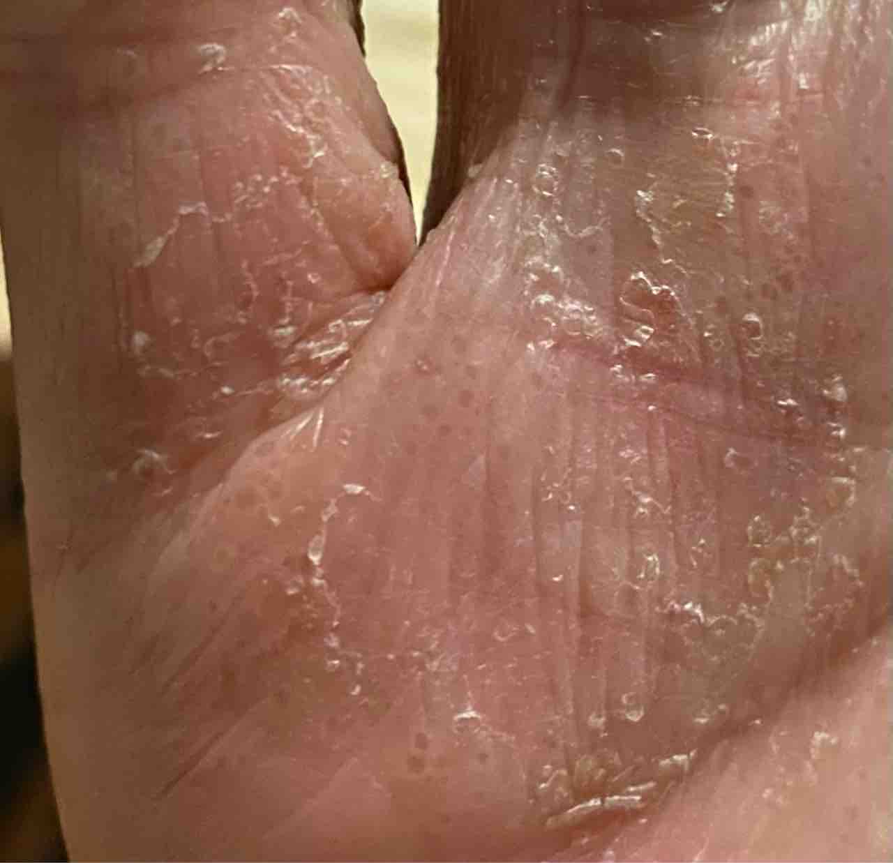 このガサガサしてるのは保湿剤塗れば良いんですけどその下の、小さな小さな水脹れみたいなの見えます?