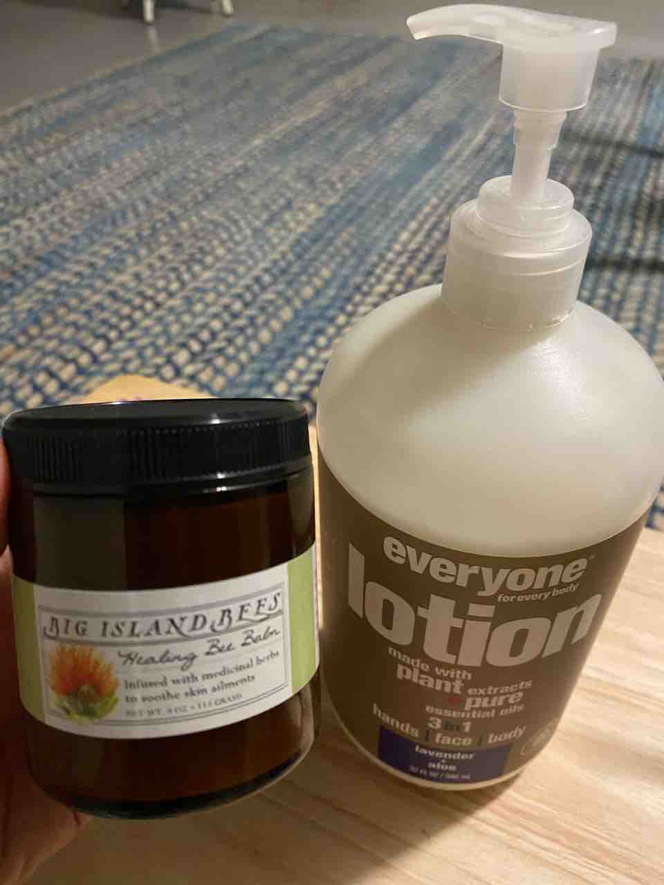 ハワイ島の養蜂場で買った軟膏と、Everyoneっていうお気に入りのブランドの保湿剤(これ顔から全身使える)