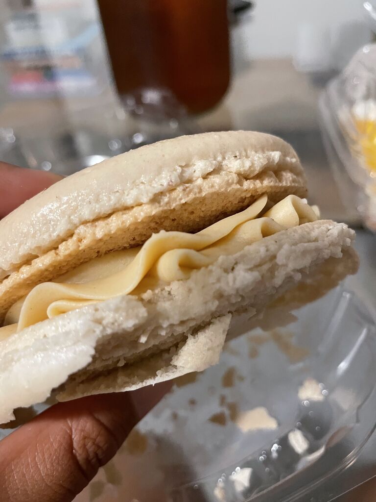 私はお腹いっぱいで特に何も欲しくなかったのだけれど夫が巨大マカロンを買いました。6ドル。