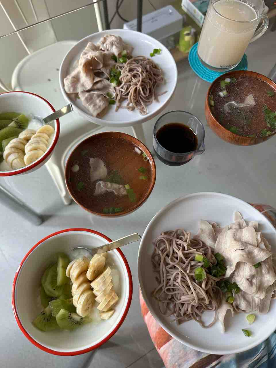 夜は豚肉とお蕎麦に、フルーツヨーグルト。