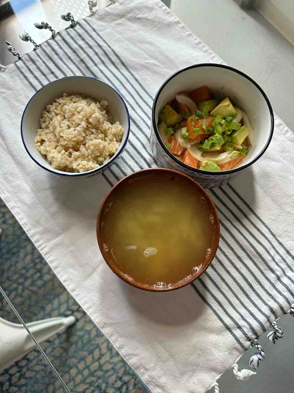 ランチはサーモンポケと玉ねぎスープに玄米!