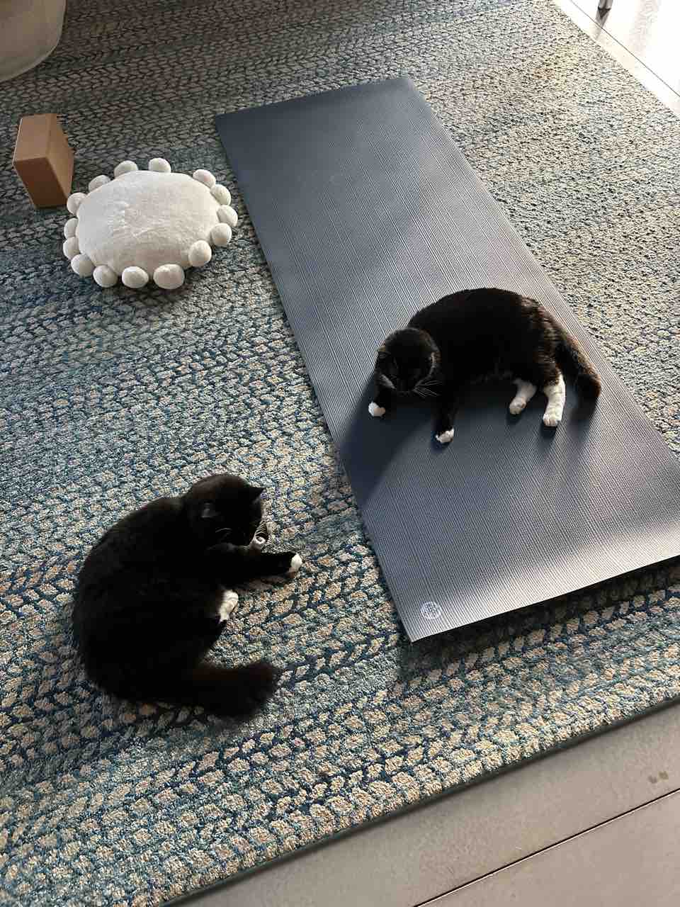 朝のストレッチ。お猫様たちに邪魔されつつ頑張る。