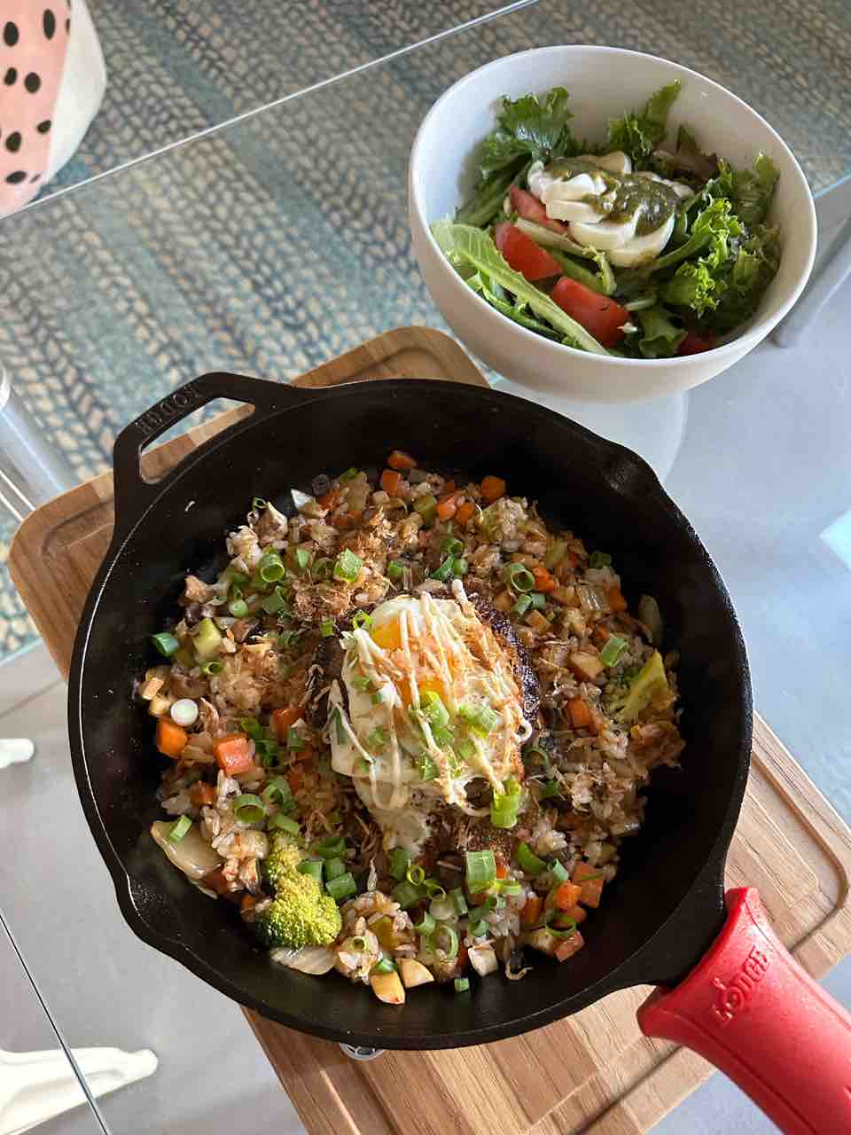 夫はサラダと野菜たっぷり(ご飯は一膳分くらい)フライドライスと、バーガーパテと卵。