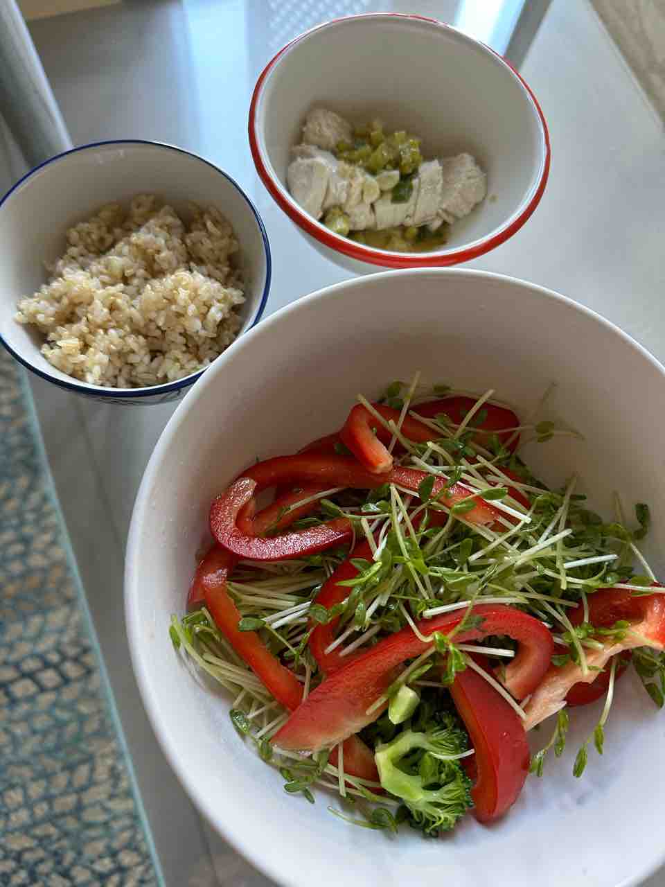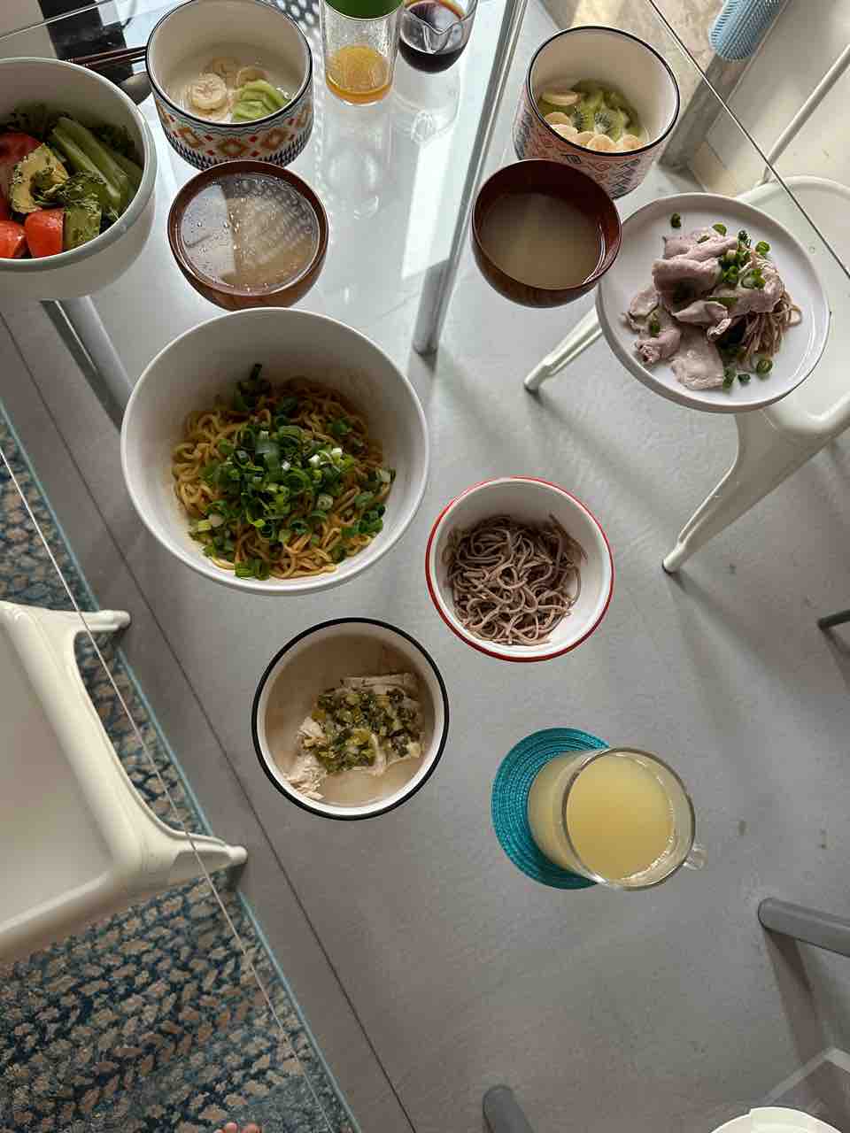 夫メシは、サラダとヨーグルト、鶏出汁のワンタンスープ、混ぜ麺、そば、ジンジャーネギソース胸肉。