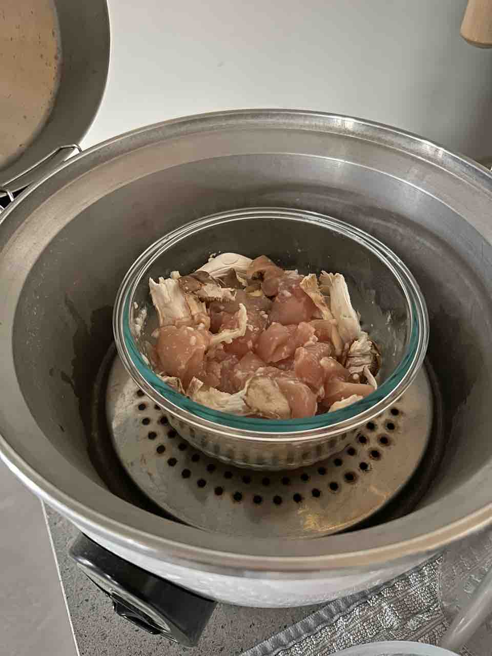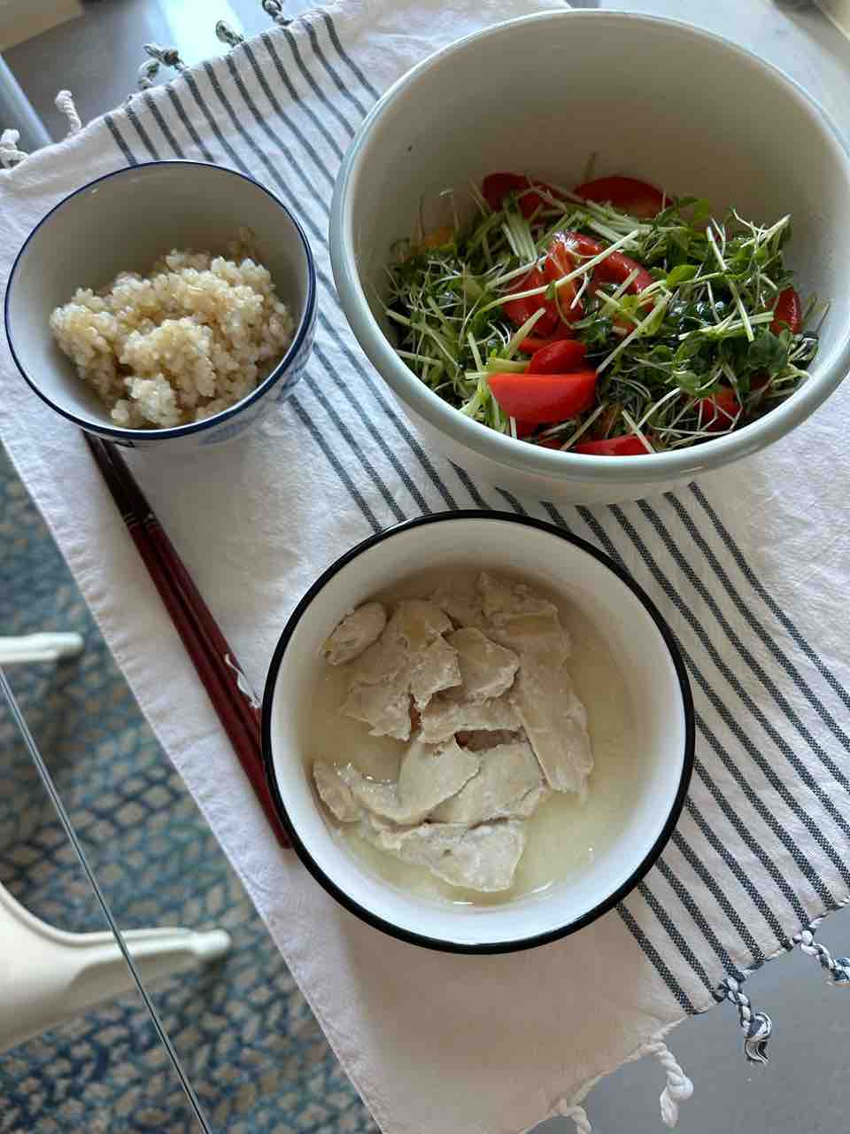 夜も同じ感じでキノコと胸肉を塩麹であえて蒸したやつ。