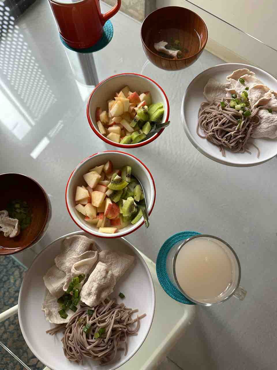 ディナーは十割蕎麦と豚肉に、フルーツヨーグルト。