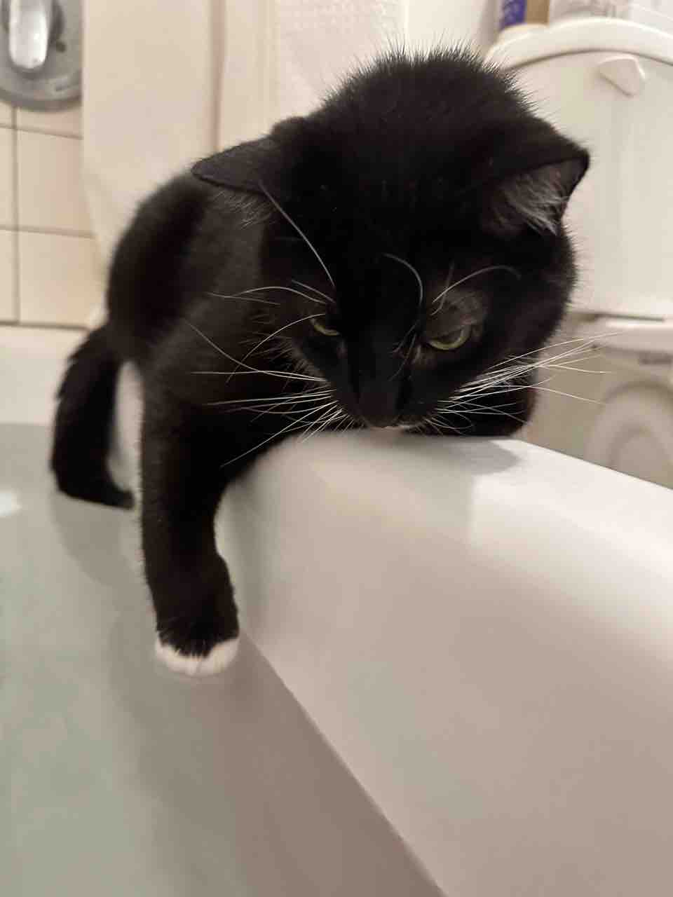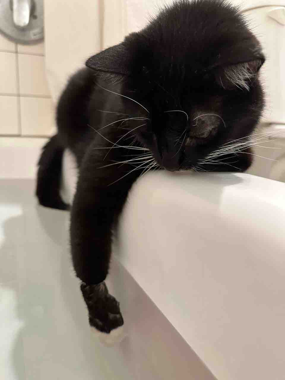 毎日入ってるから気になってきたのか、最初は尻尾で参戦。お次にお手手を…