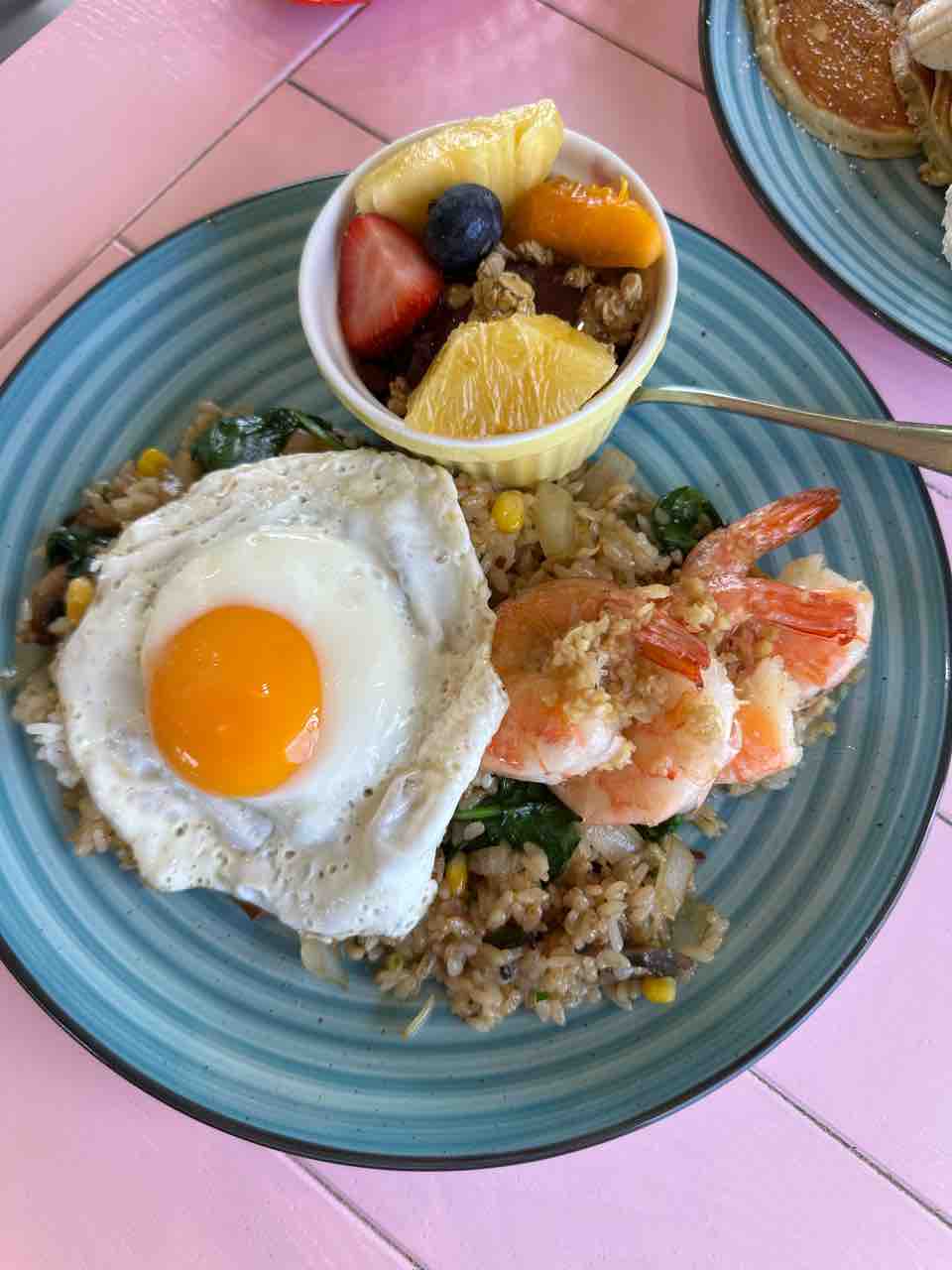 フライドライスとアサイーボウル、ガーリックシュリンプの全部盛り。