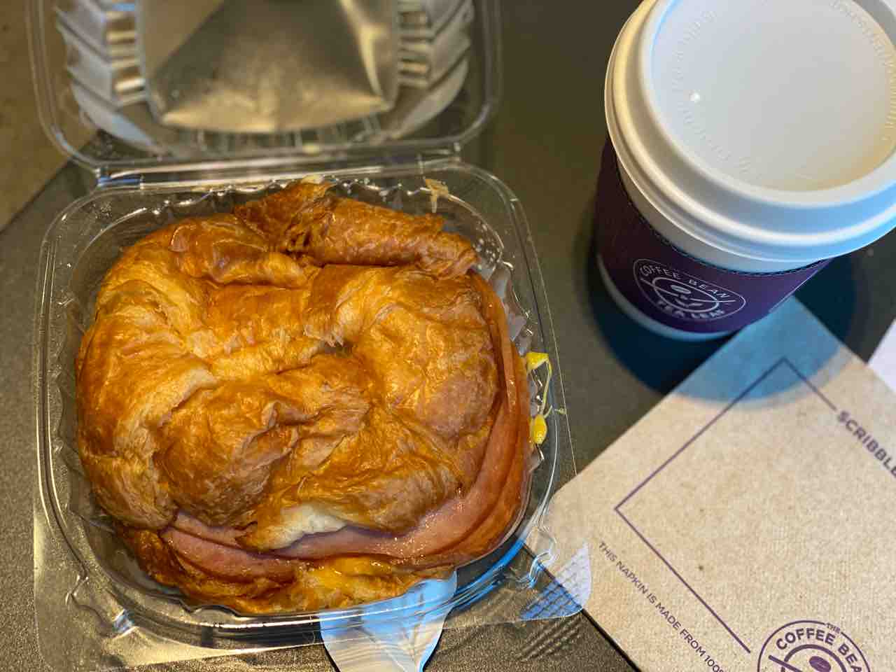 ホットコーヒーと、ターキーベーグルサンド。サンドイッチは夫と半分こ。とか言いつつ、わたしが2/3くらい食べました。