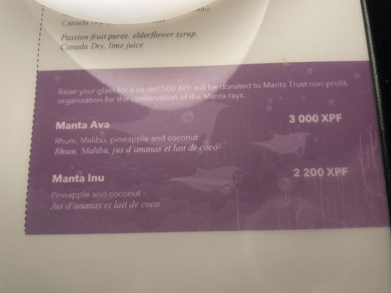 ドリンクは、マンタトラストへの支援につながるマンタAVAと、マンタイヌにしました。マンタイヌの方はノンアル!