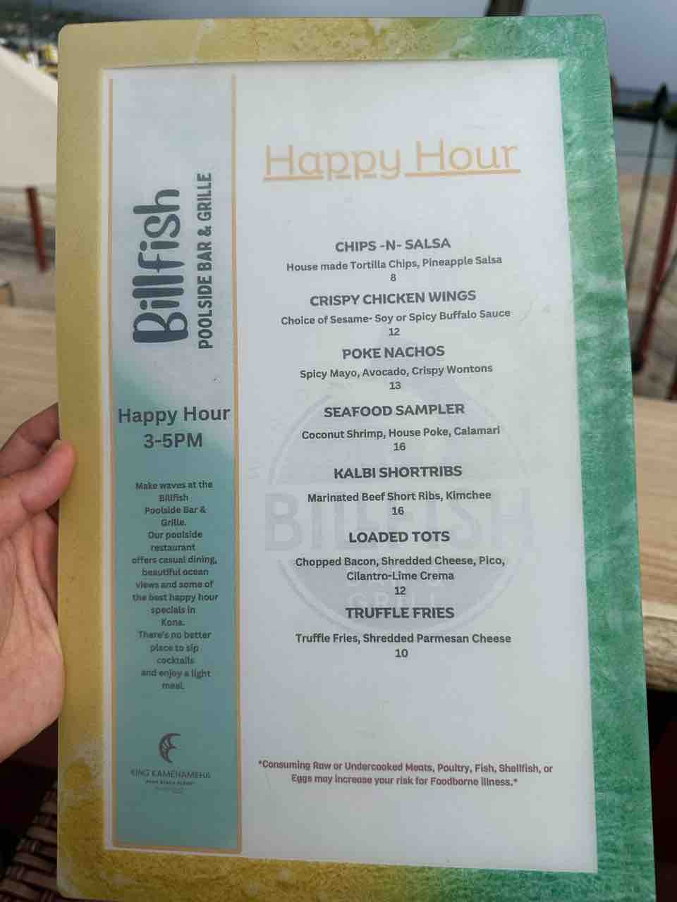 ビルフィッシュのハッピーアワーのメニューはこんな感じらしい。