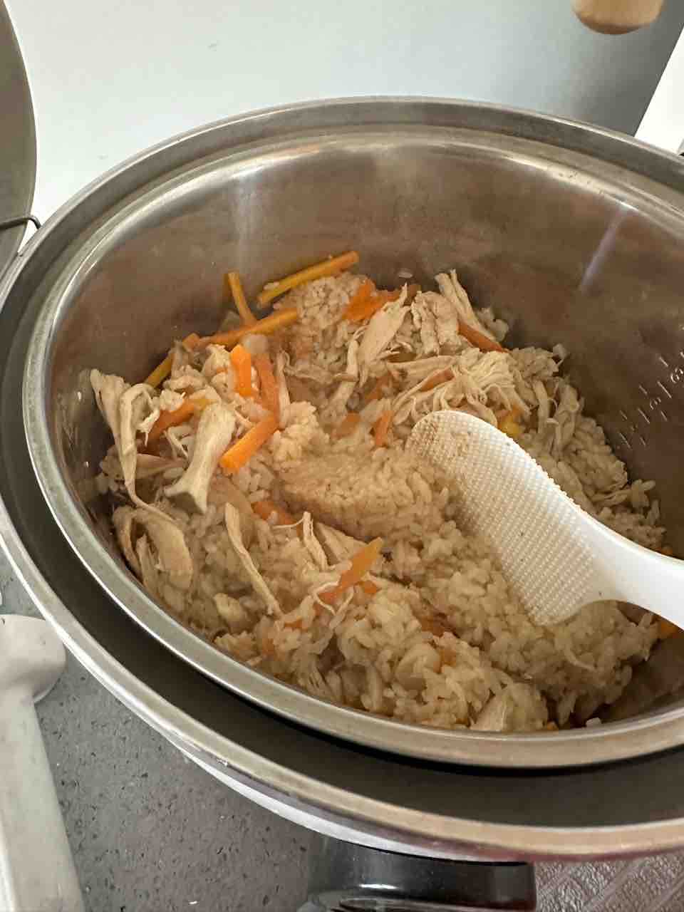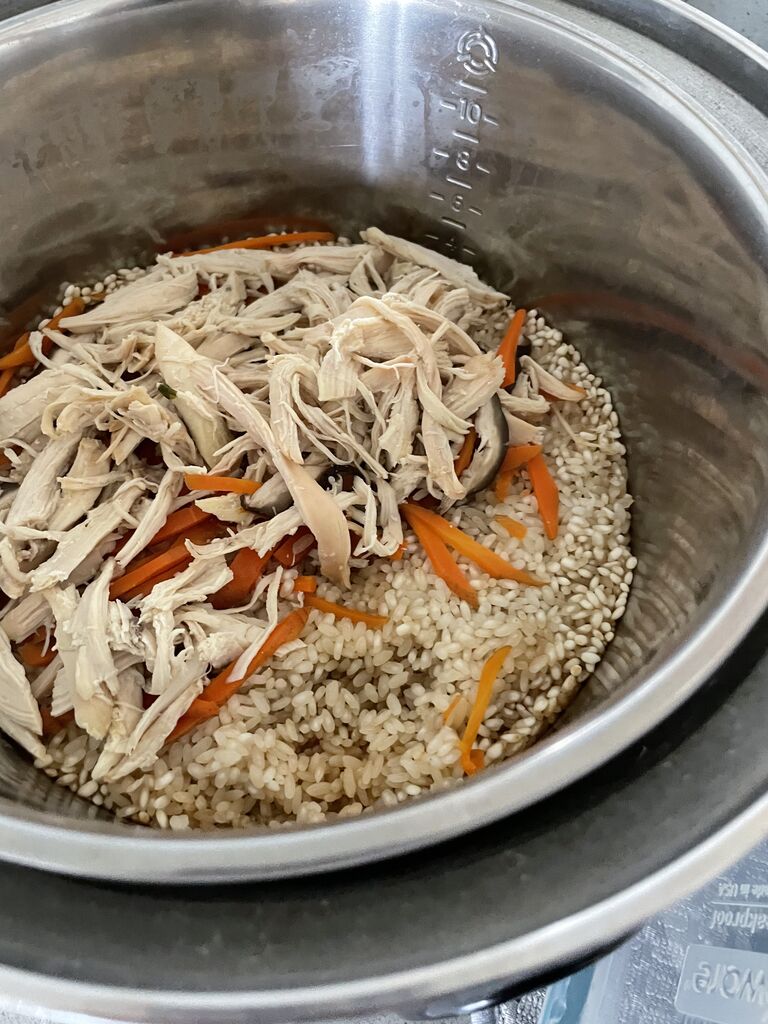 キノコ、にんじん、コストコのロティサリーチキンなどをどっさり入れて外釜1.2カップで炊きました!