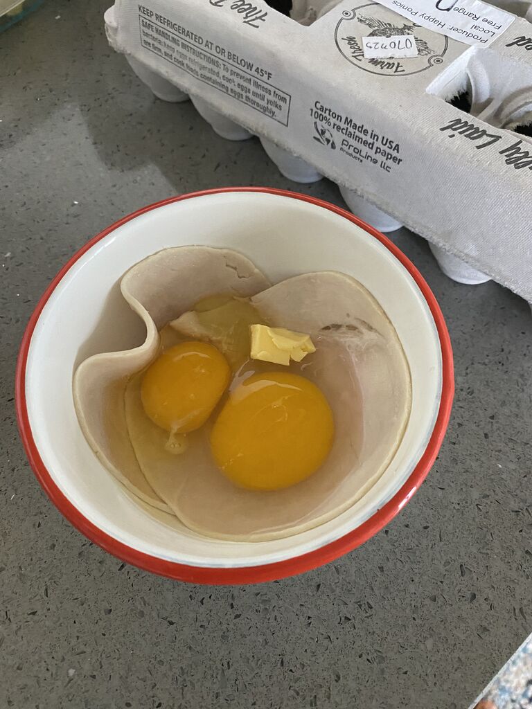 ならば下にハムを敷けば良いのでは!?って思って敷いたんだけど、この時点ですでに、卵が外に出ちゃった😂