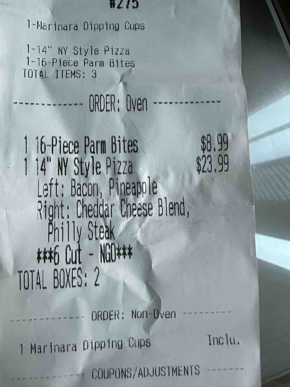 普通に買うとピザが24ドルで、Parm Bitesが8.99ドルもするらしい…!