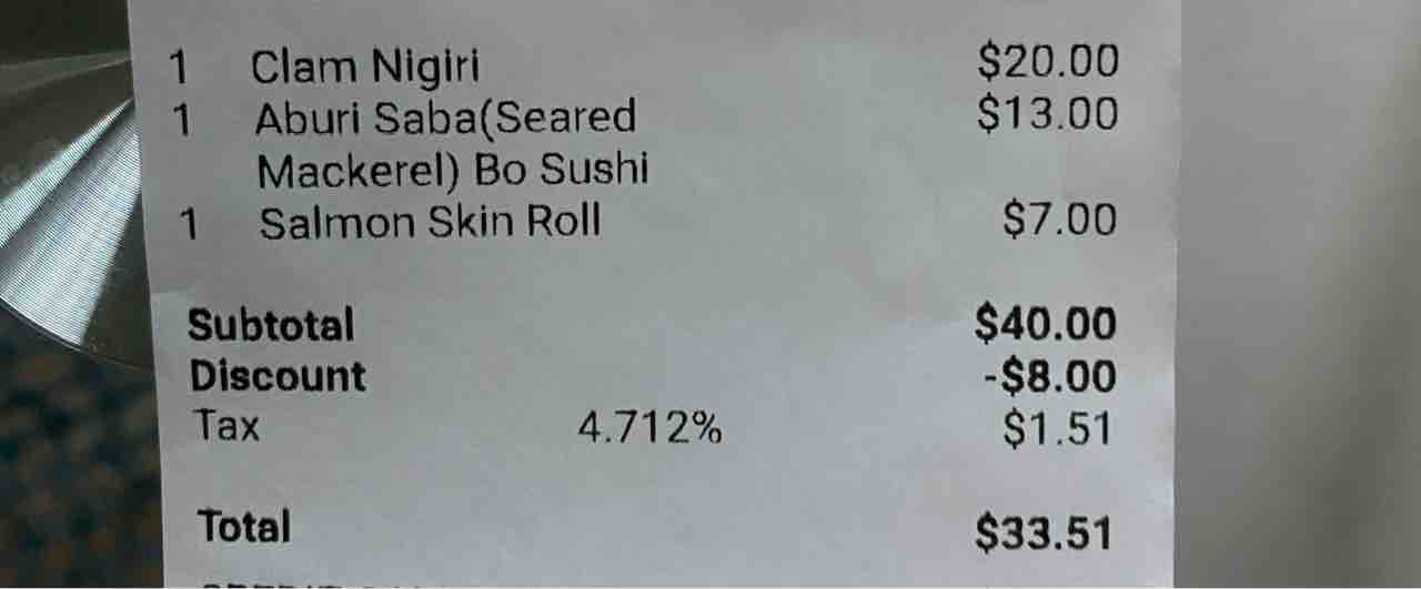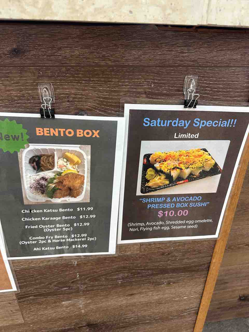 サーモンの押し寿司14ドル、デイリースペシャルのアボカドとエビの押し寿司10ドル、大学芋4ドル、クラム握り20ドル、炙りサーモンの握りが7ドル。