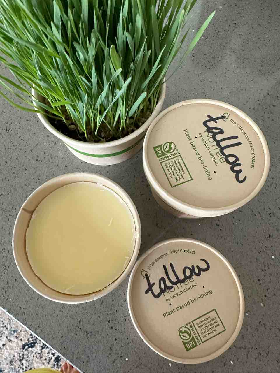 オンラインでオーダーした牛脂をピックアップしてきました。(葉っぱはファーマーズマーケットで買った猫草)