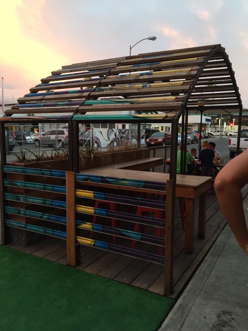 すごく混んでいて食べるところがないので、ちょっぴり歩いてcoralストリートにある、パークレットで。