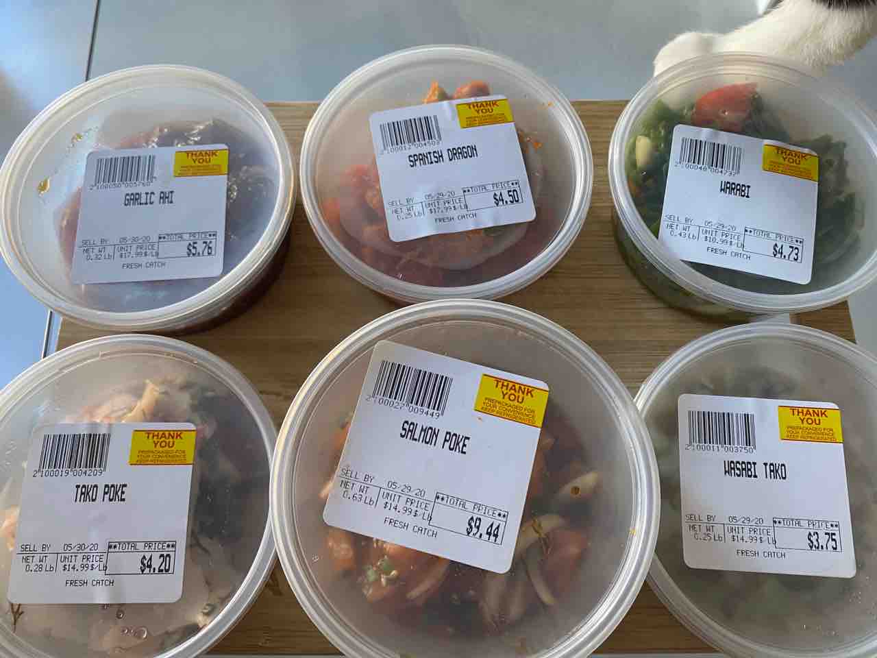 ガーリックアヒ、スパニッシュドラゴン、わらび、たこ、タコワサをクウォーターパウンドずつ。サーモンポケをハーフパウンド。