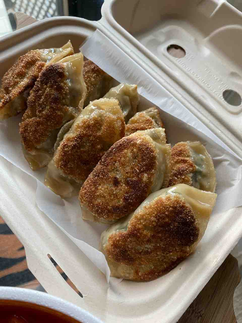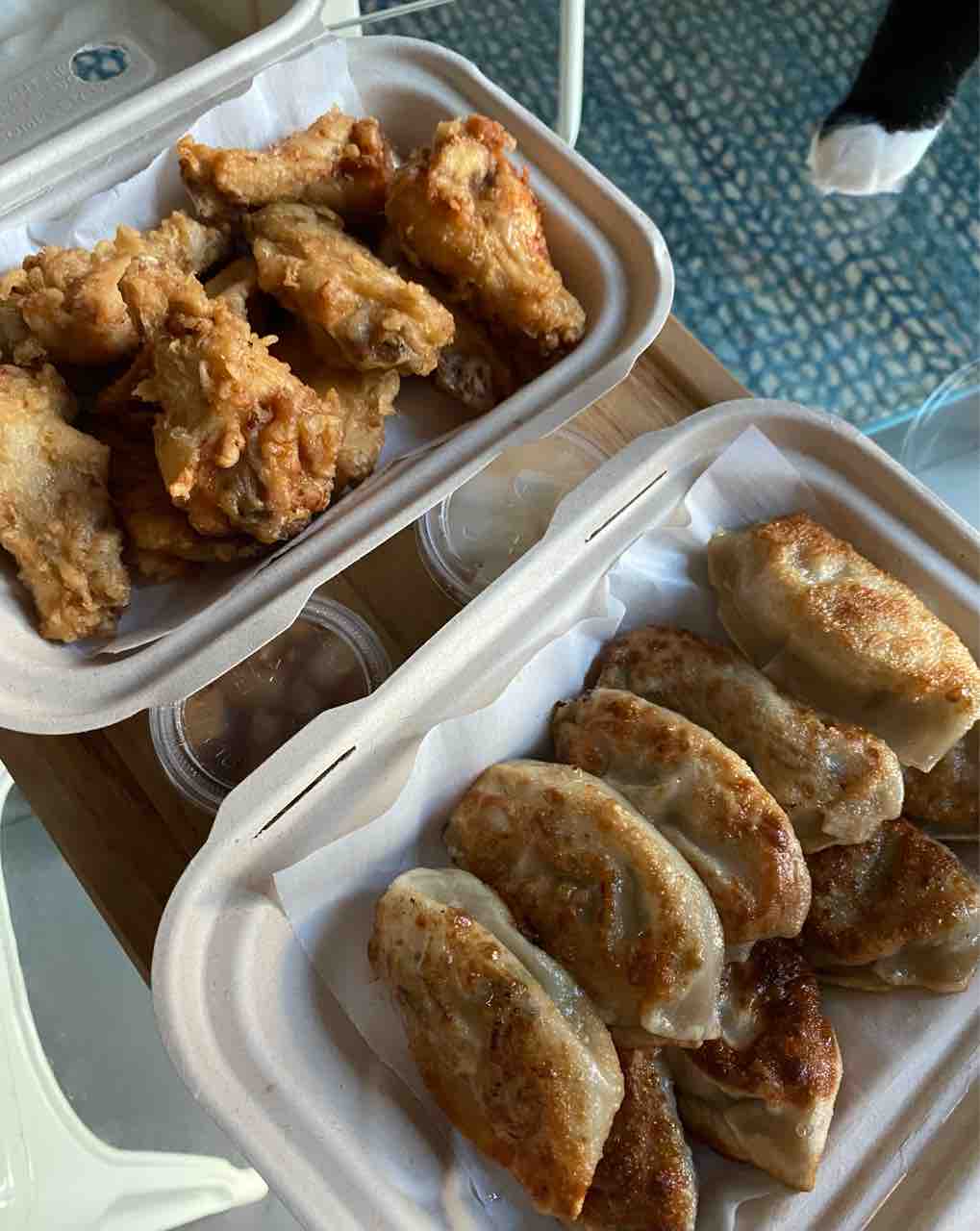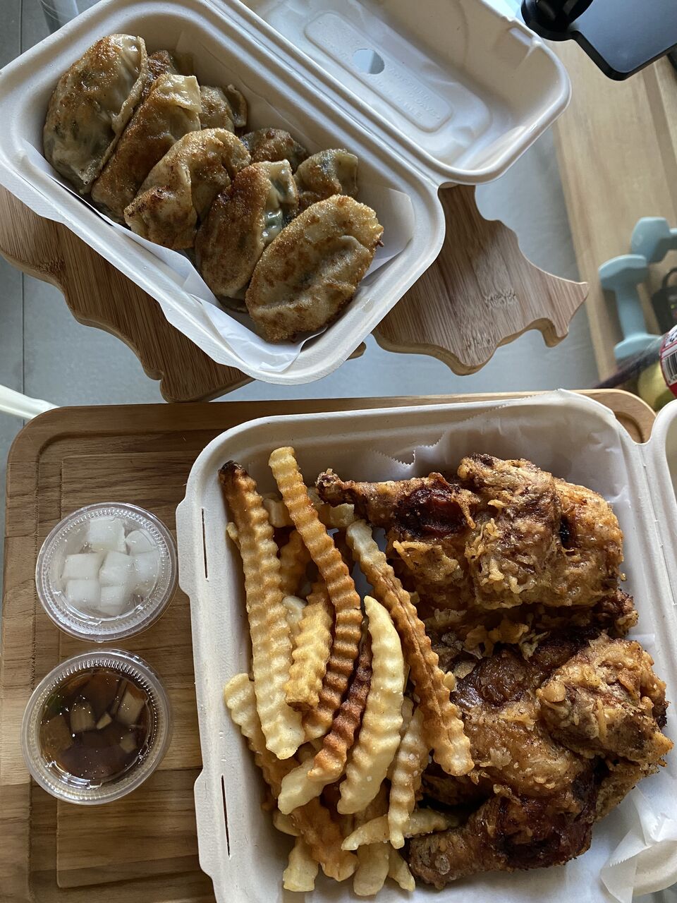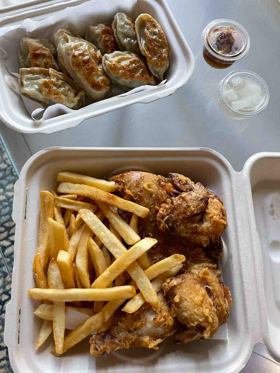 餃子(フライドポークマンドゥ)12.95ドルと、ホールチキンセット20.95ドルを購入。