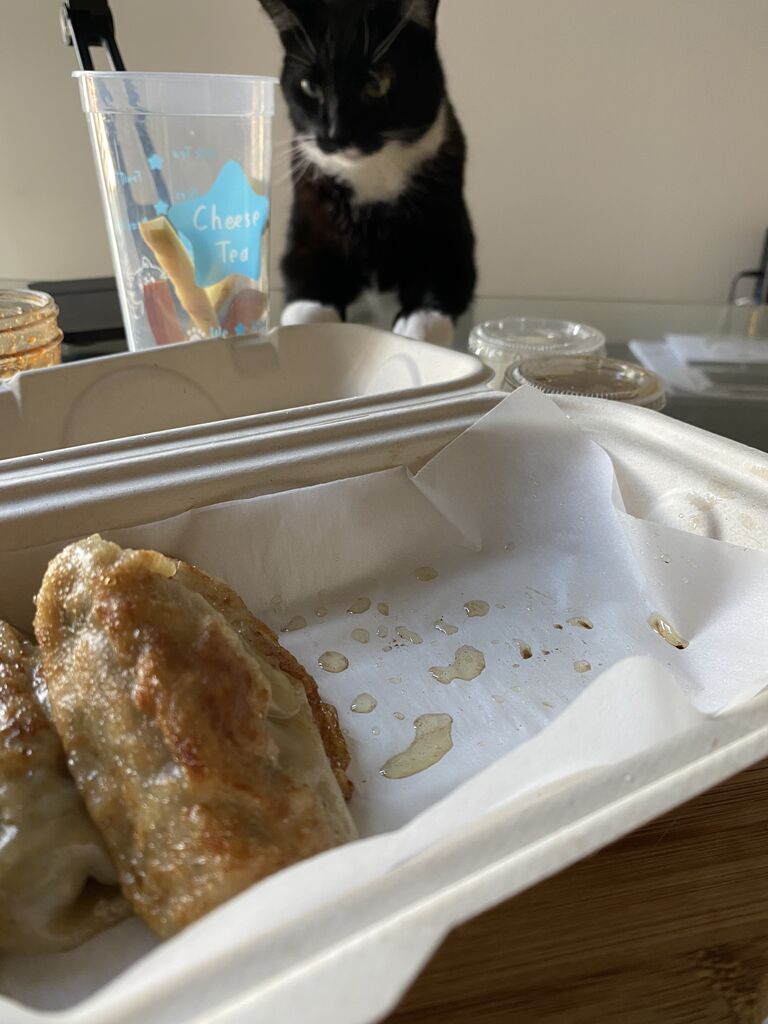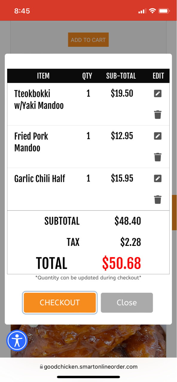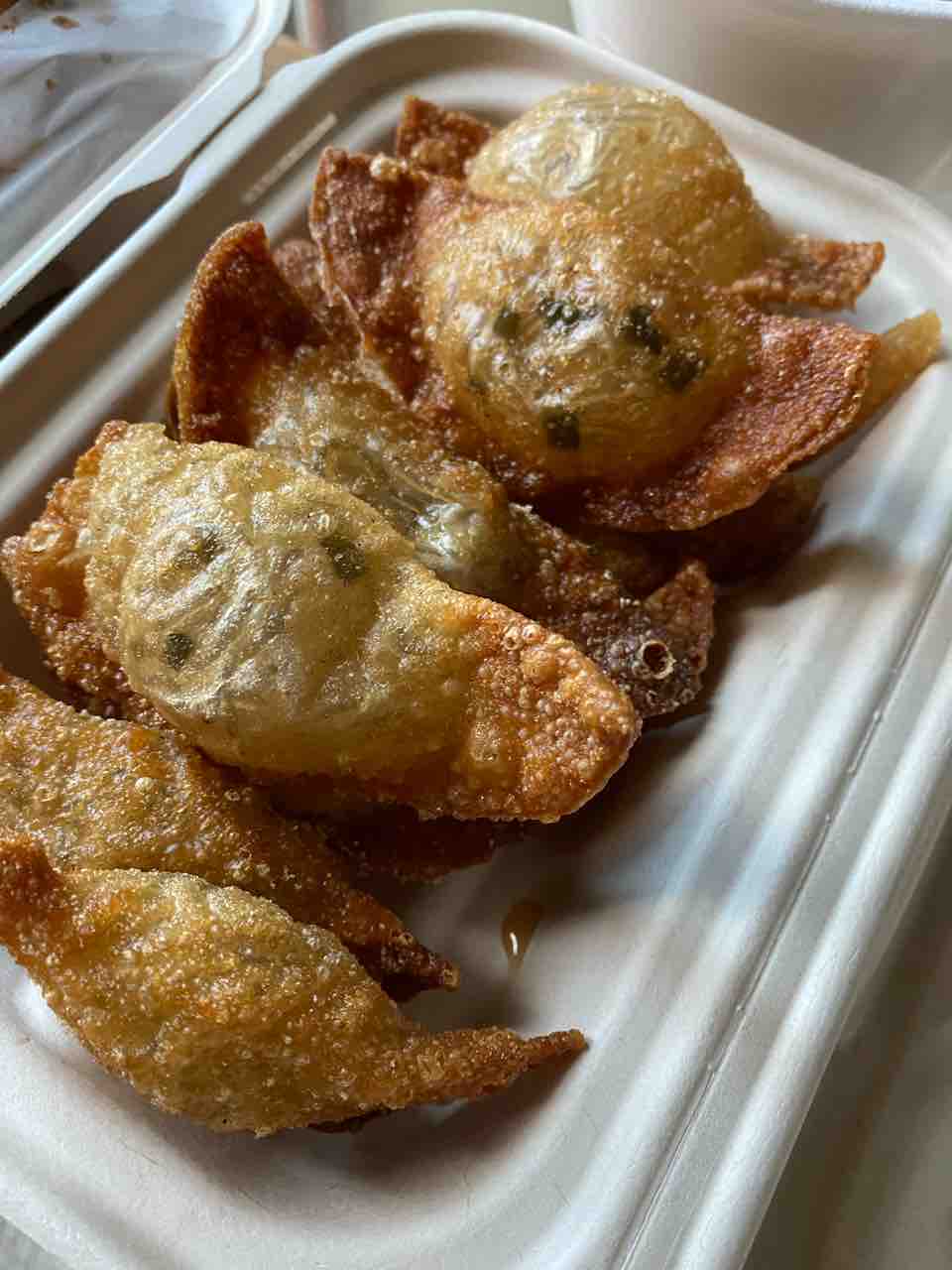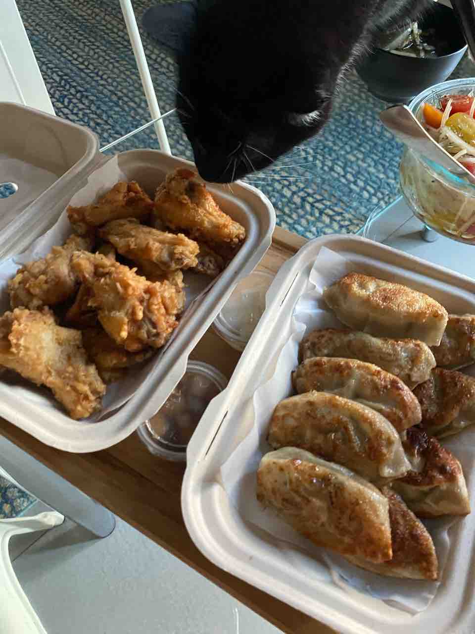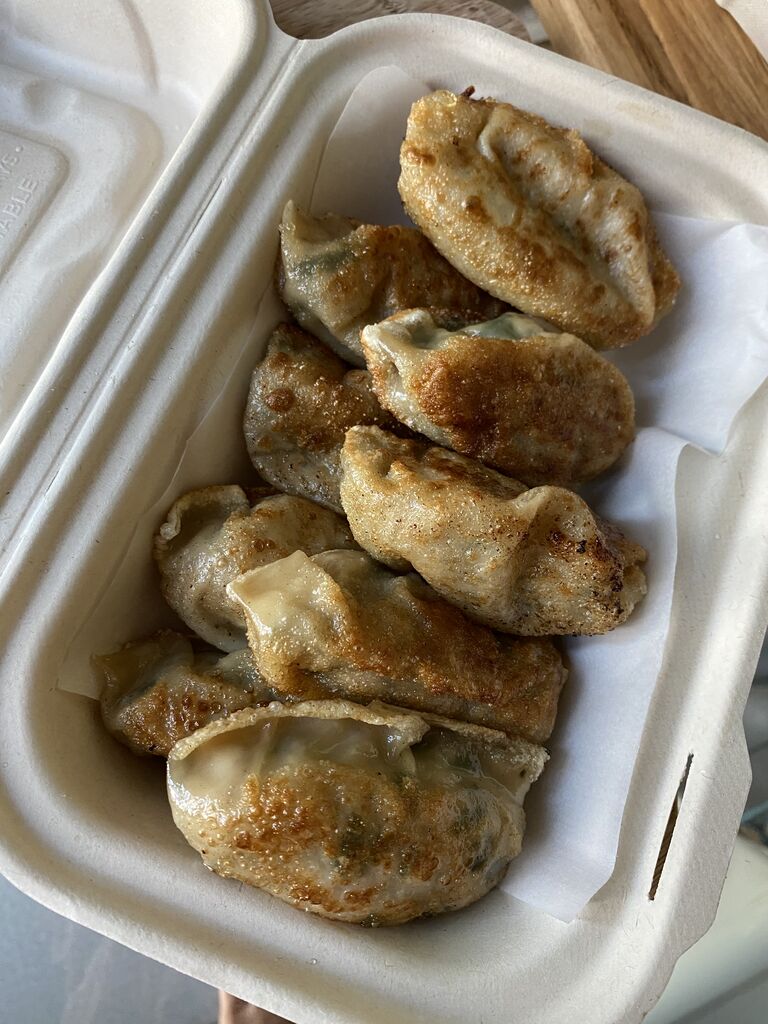 餃子(フライドポークマンドゥ)12.95ドルと、ホールチキンセット20.95ドルを購入。