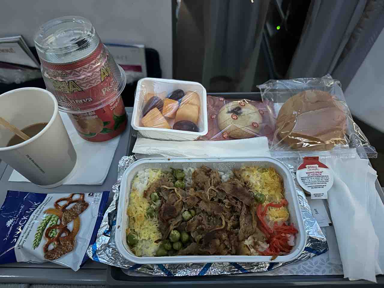 フライトアテンダントに投げるように渡された機内食。