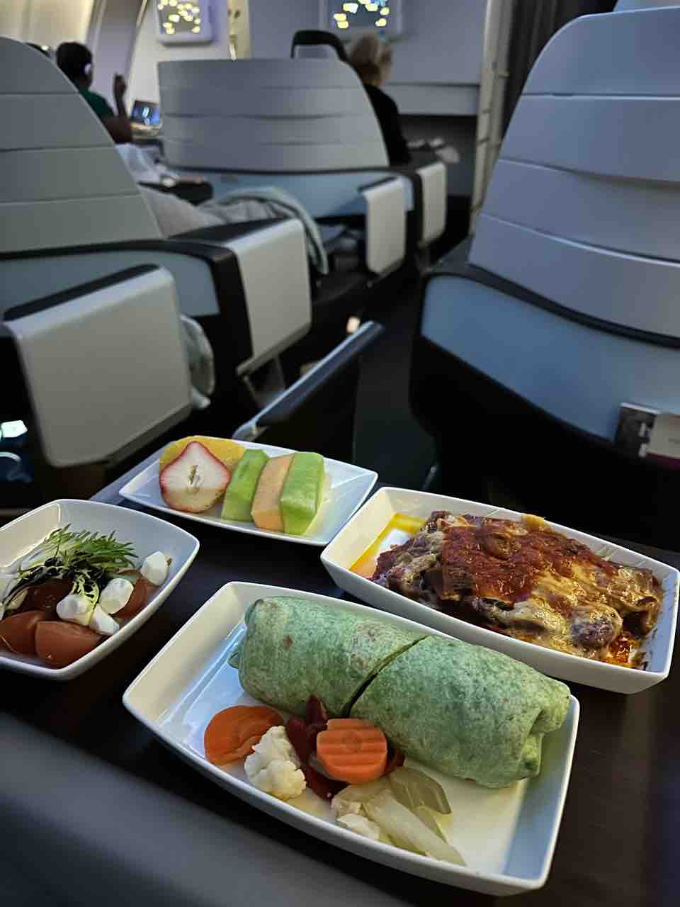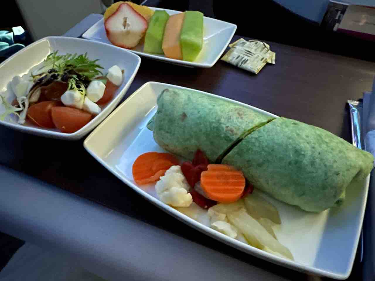 結局ちょっと起きてフルーツを摘んでたら「あっ起きたの?」とCAに言われる。