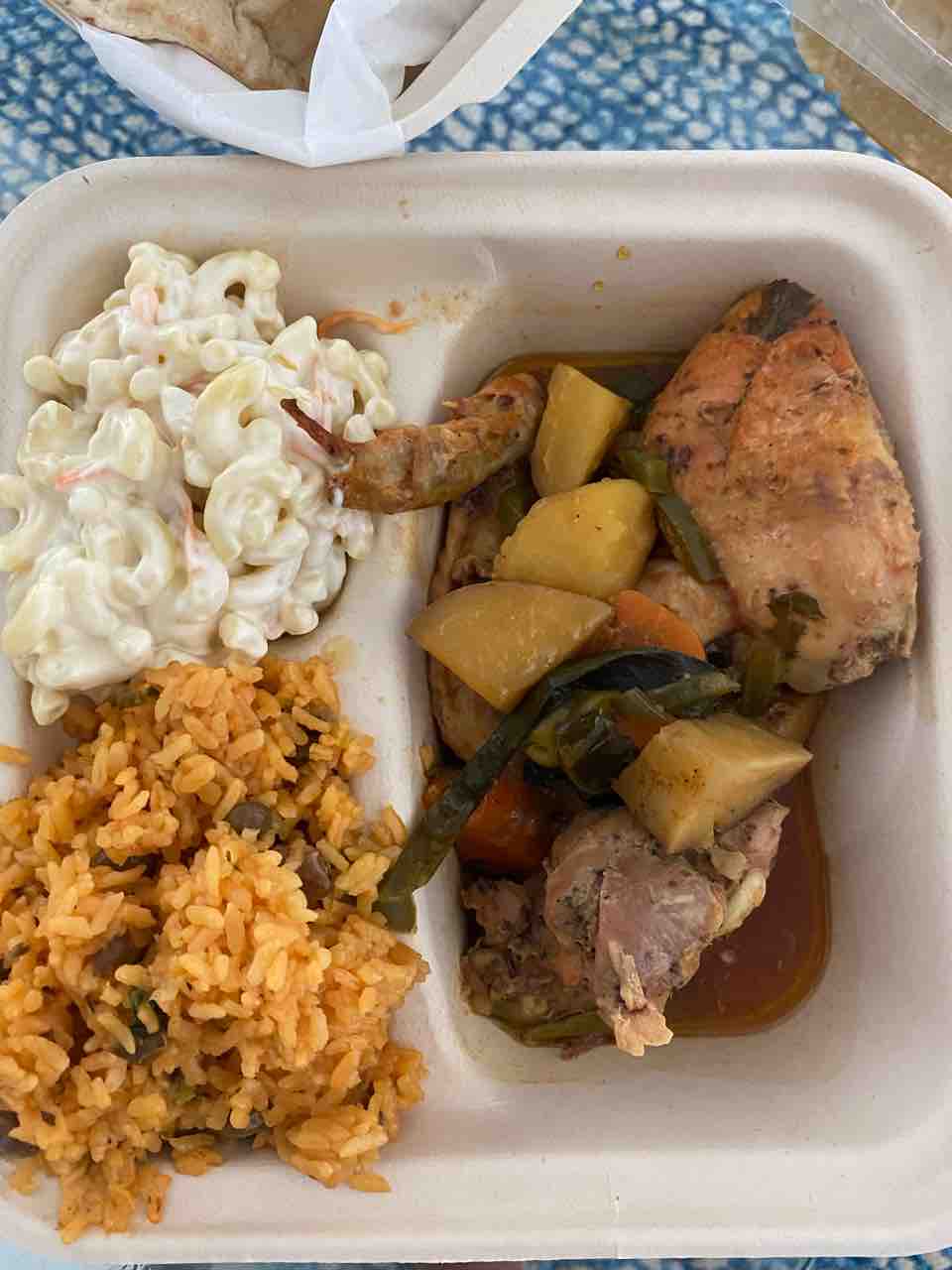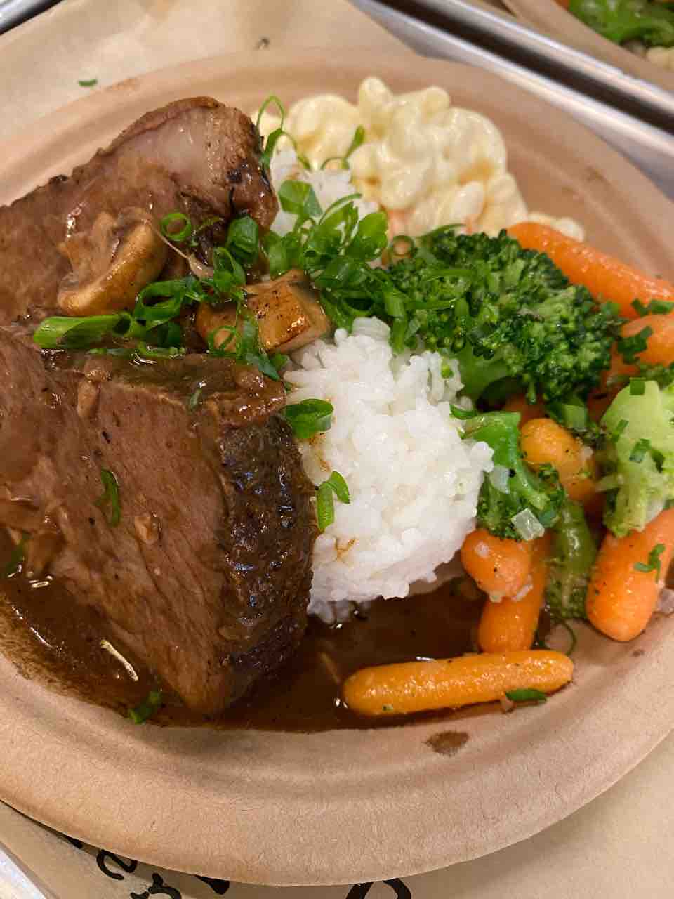 お肉に野菜がゴーロゴロ。ご飯(炊き具合バッチリ👍)山盛りに、マカロニサラダ(茹で具合バッチリ👍、サラダとボリューミー!