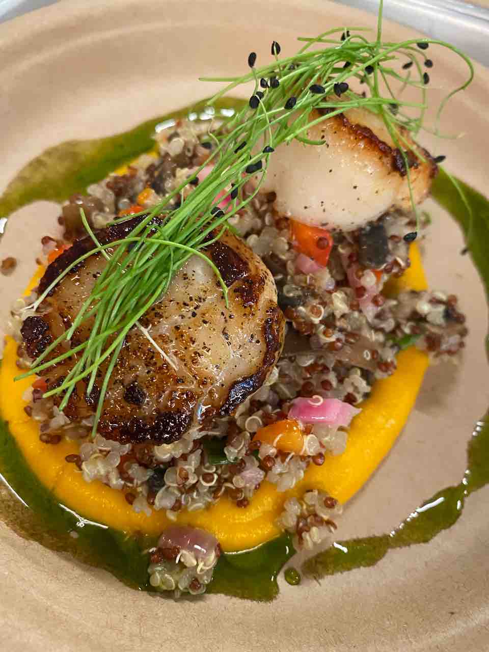 周りの緑のオイルはチャイブオイルだそうです。チャイブを茹でてあれこれするらしい。これがまた美味しいのよ。