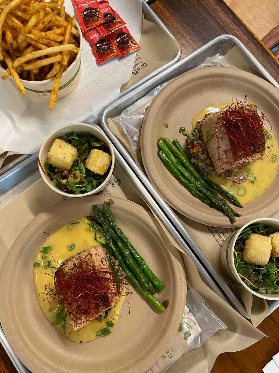ソースがめちゃくちゃ美味しい、ポテトうまい、そしてこの太いアスパラがうまい…!