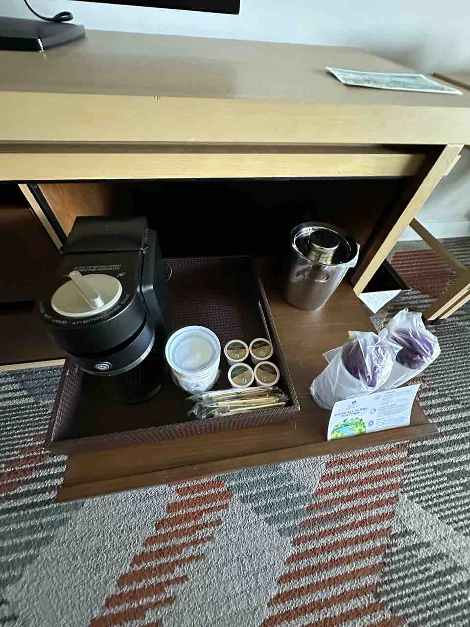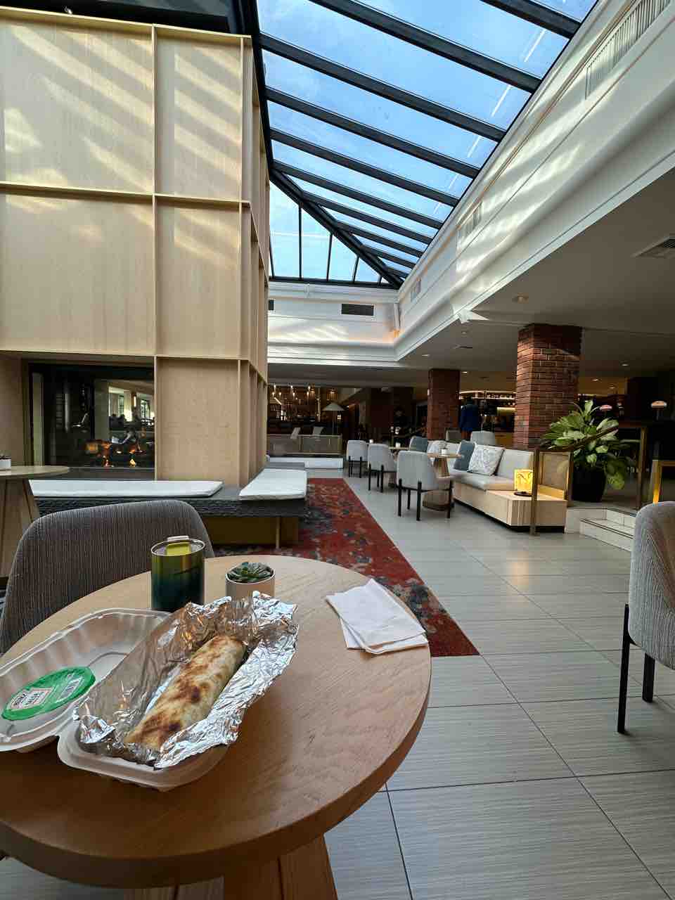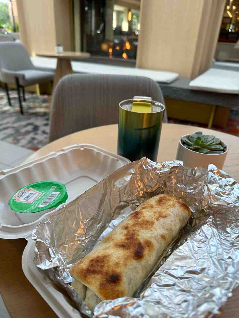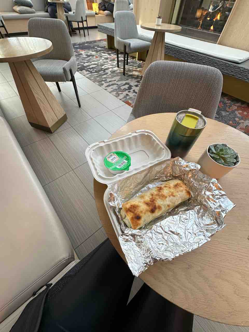 ホテルカフェで買ったブレックファストブリートーに、お部屋のコーヒーマシンで作ったコーヒー(節約✨)をホテルロビーで頂きました!