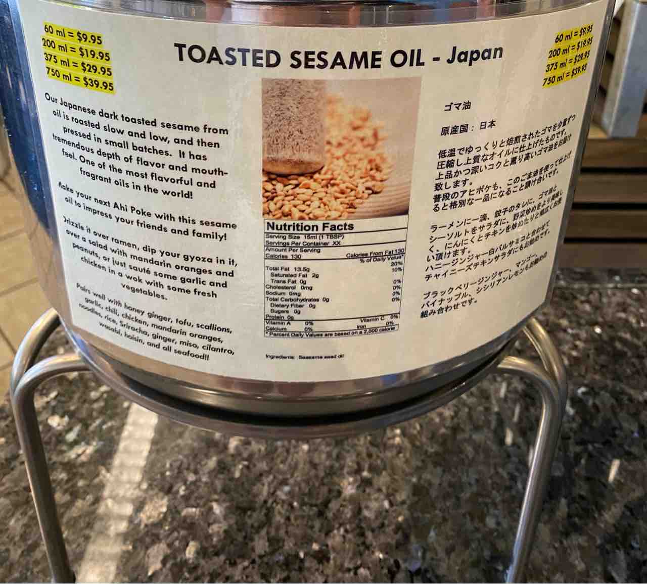今回買ったのはこちら〜!ごま油は19.95ドル、シナモン梨18.45ドル!