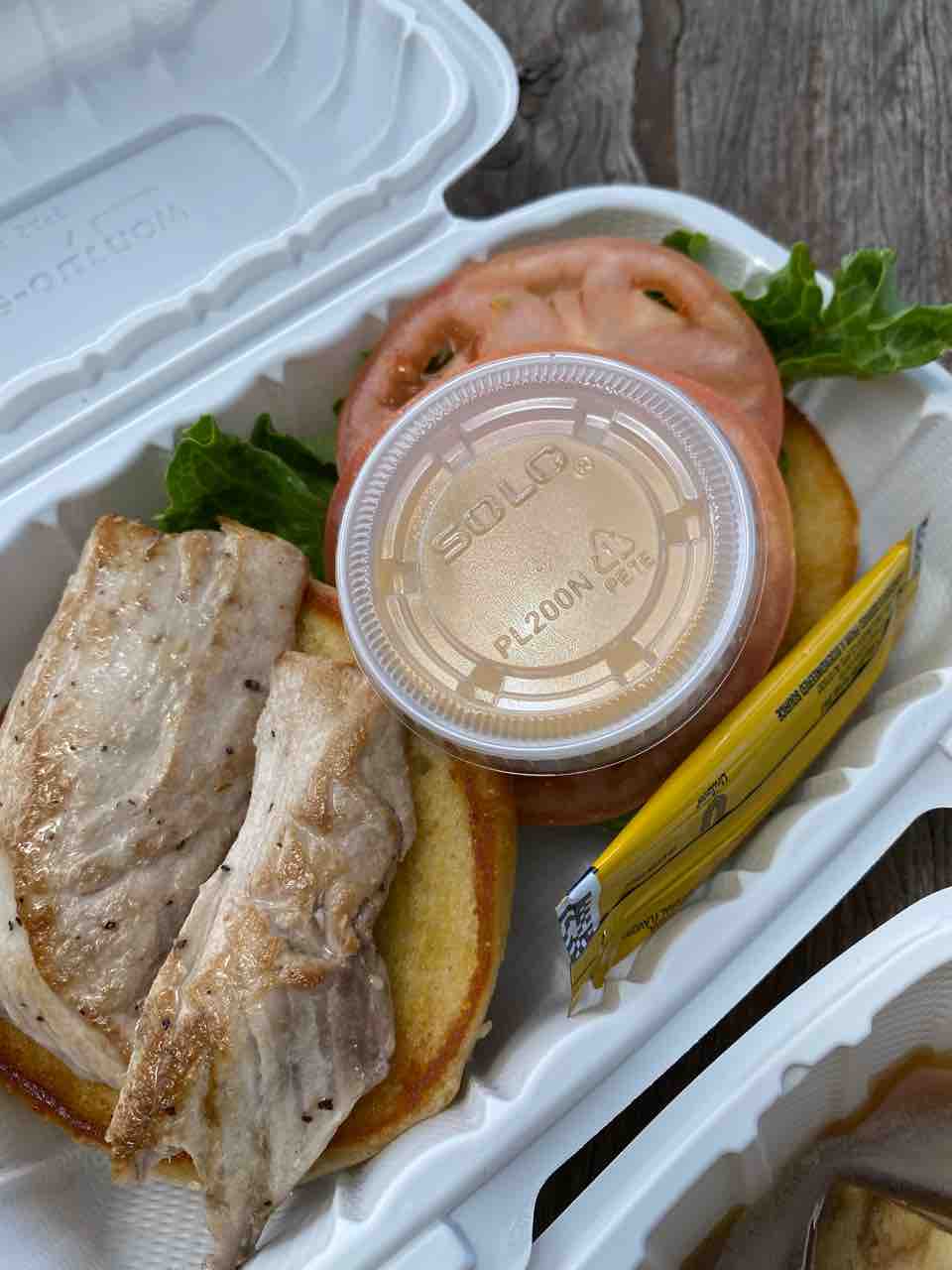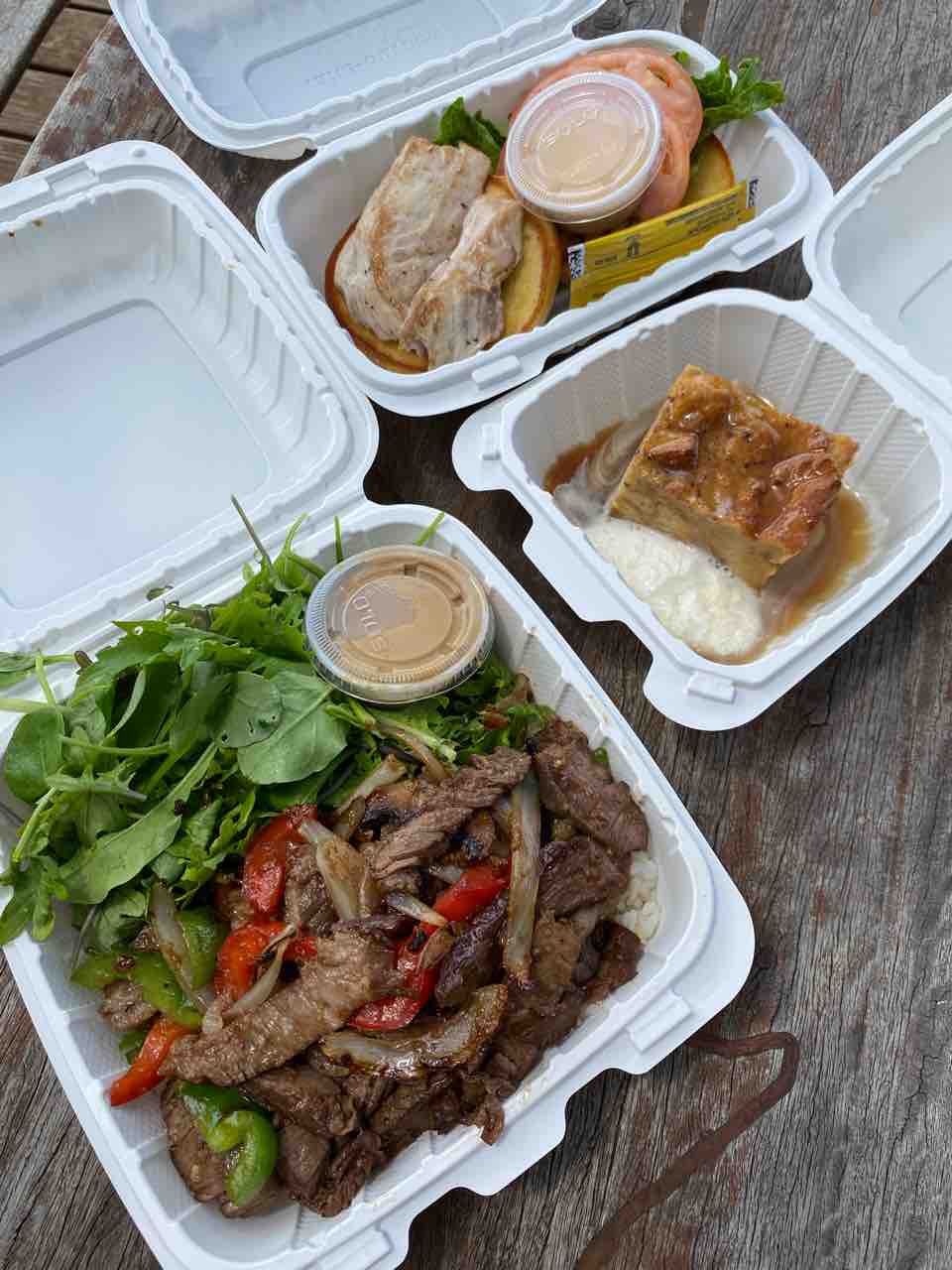 チョップステーキのプレート、アイランドフィッシュサンドイッチ、ブレッドプディングを購入。