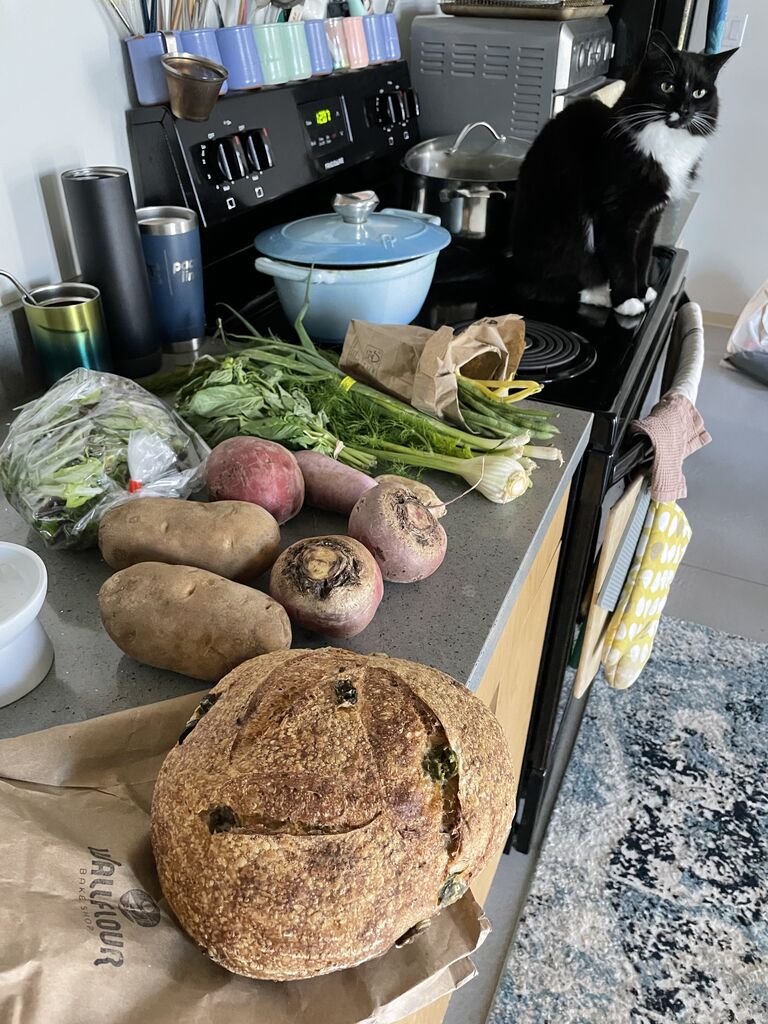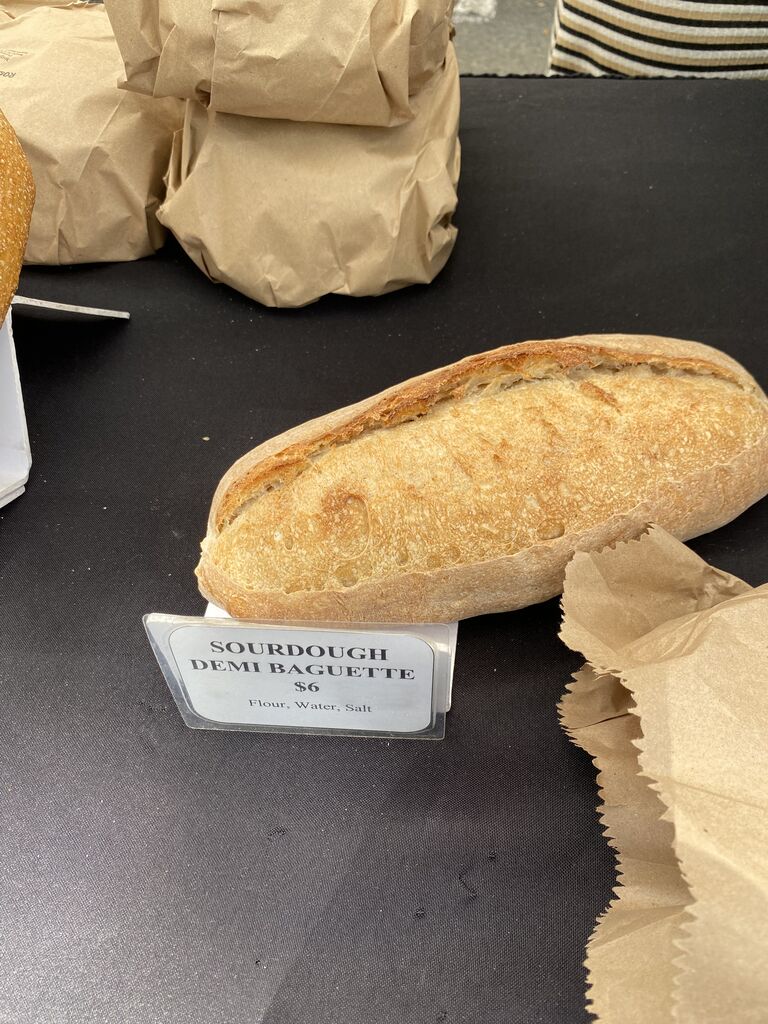昨日はウキウキファーマーズマーケットへ。お気に入りのパン屋さん、ウォルフラワーでサワードウ(8ドル)も購入。