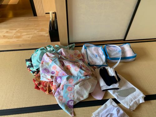 1人7000円で、着物や小物のレンタル、ヘアセットをしてくれます。着付けてもらったあとは、ウロウロお散歩して、部屋に戻ったら備え付けの袋に入れておけばハウスキーパーが回収してくれるの!