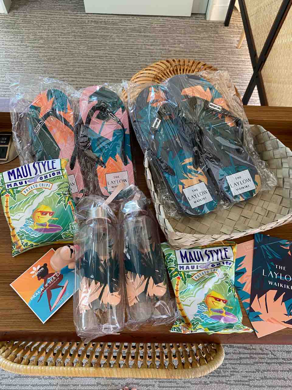 超可愛いビーサンに、ウォーターボトル、チップス、ポストカード、マノアチョコレート!
