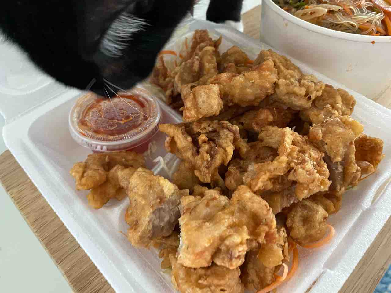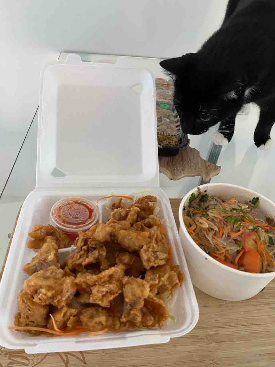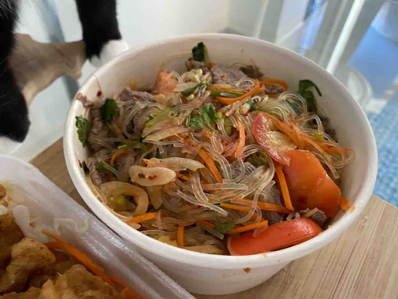 ウーバーイーツのピックアップで頼んでおいた、タイフライドチキンとヤムウンセン(ビーフ)。