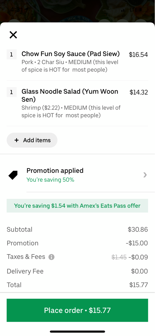 Ubereatsの50%オフクーポンがあったのでそちらを使わせて頂きました✌️