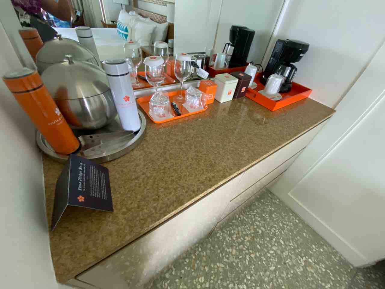 それからウォーターボトルがついてくるので、ホテルのいろんなところにある給水所で水を自分で汲むスタイルです。