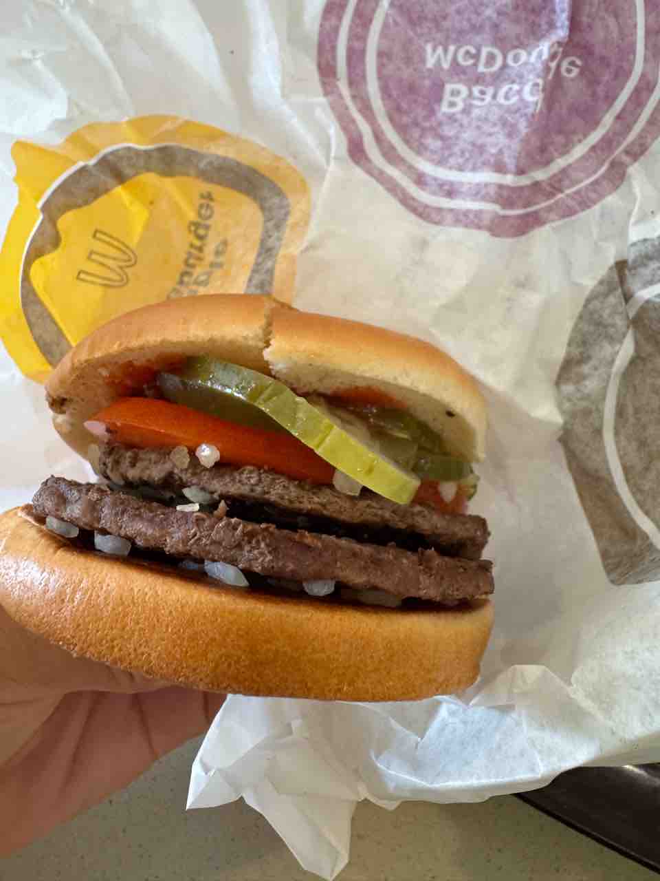 それからダブルチーズバーガーなのにチーズ抜きにして、ピクルス多め。